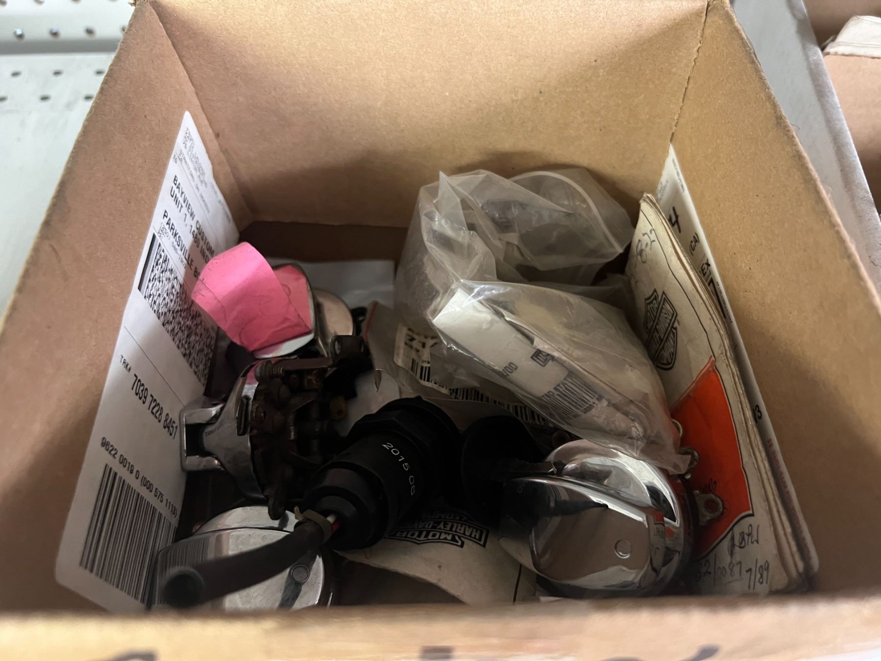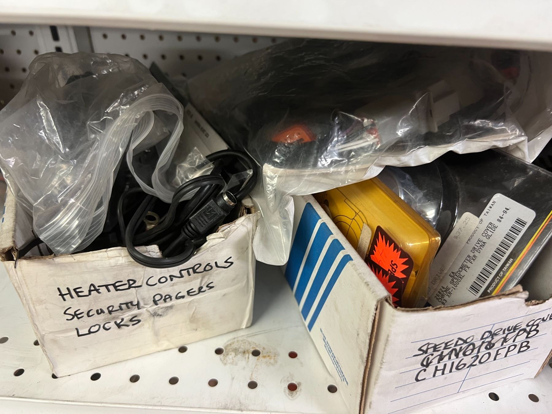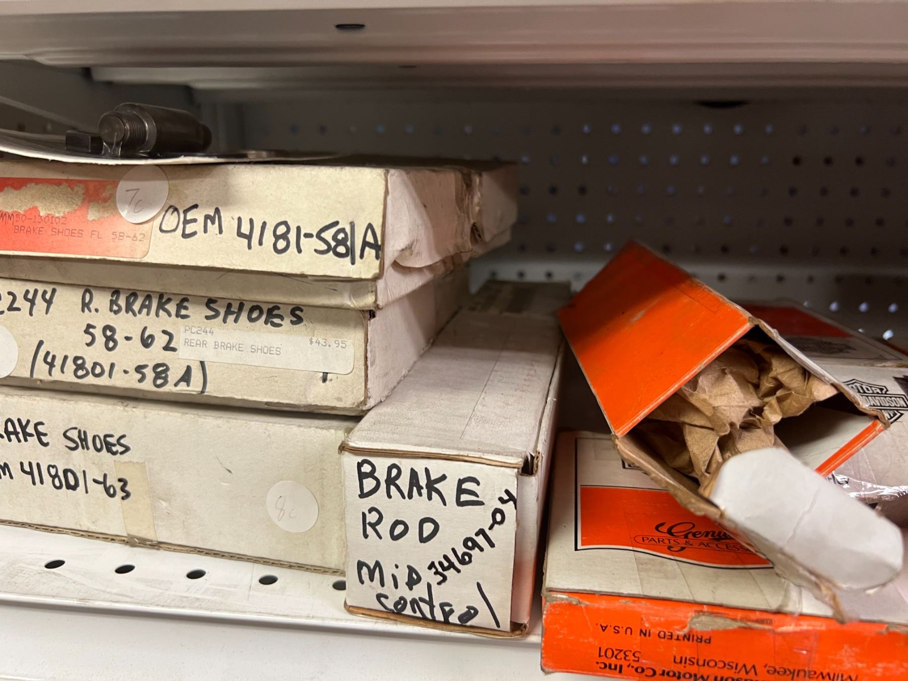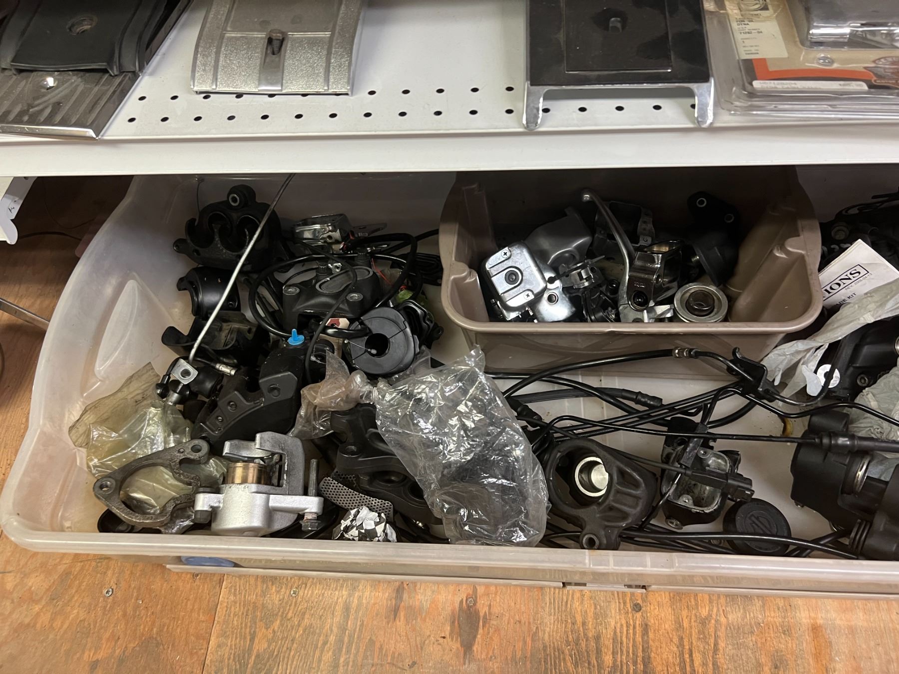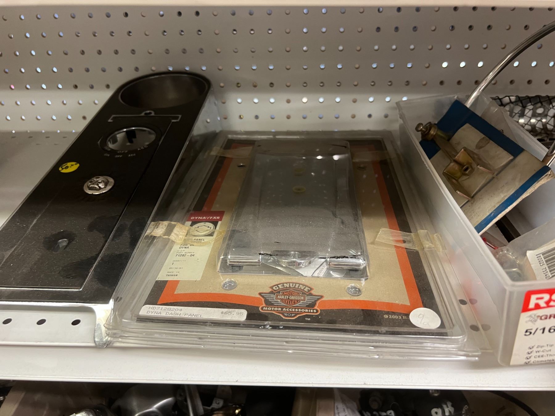 SHELF LOT OF INVENTORY - HARLEY-DAVIDSON HIGH FLOW FILTERS (APPROX 50 PIECES) IGNITION SWITCHES & KEYS, FENDER RAILS, HORNS, BRAKE SHOES, STEREO HELMET SETS, BRAKE CALIPERS ETC