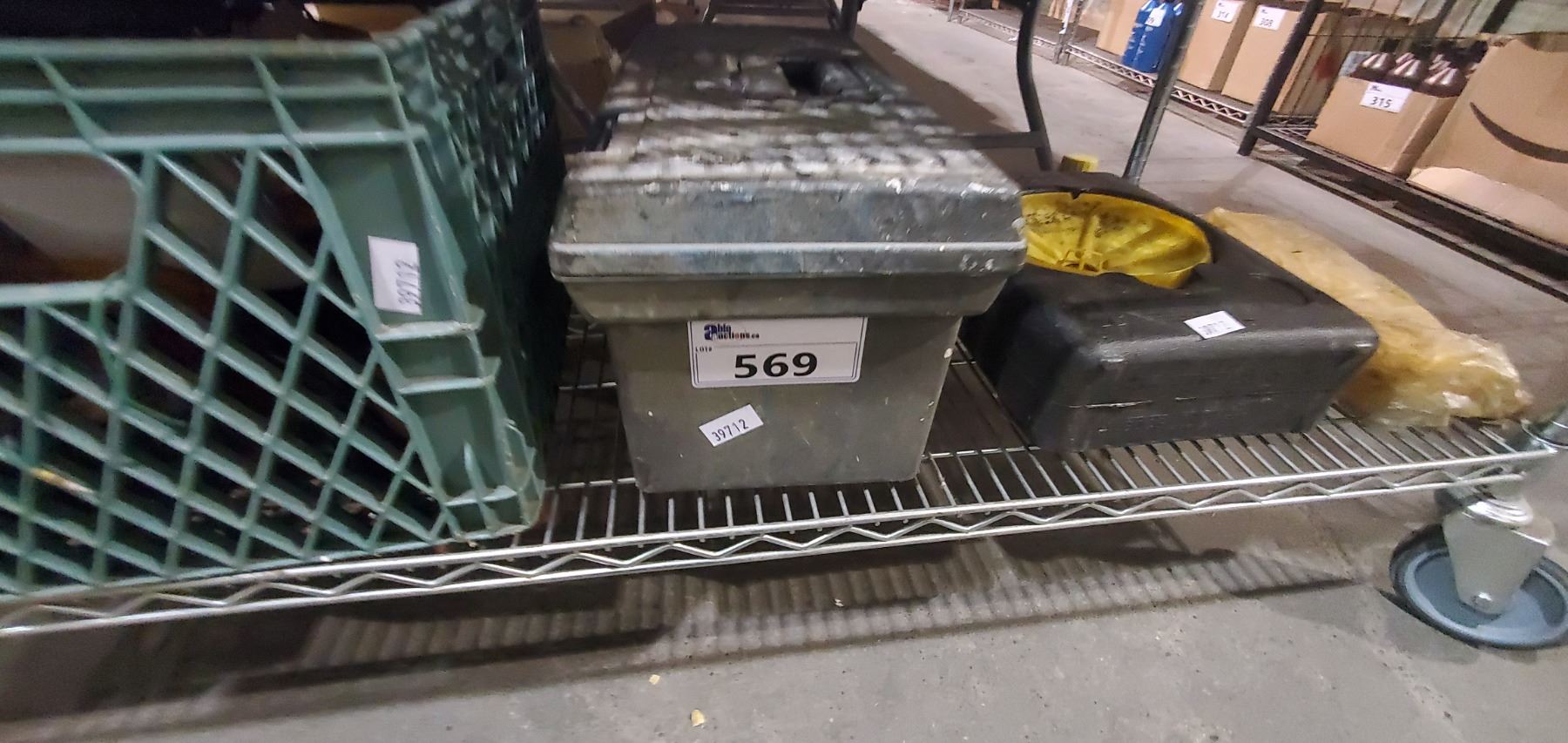 SHELF LOT OF LIGHTS IN TOTES, OIL CHANGE CAN, BOX OF TOOLS, AND MORE