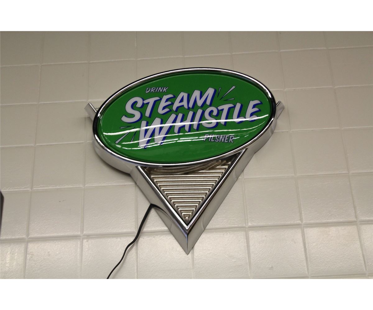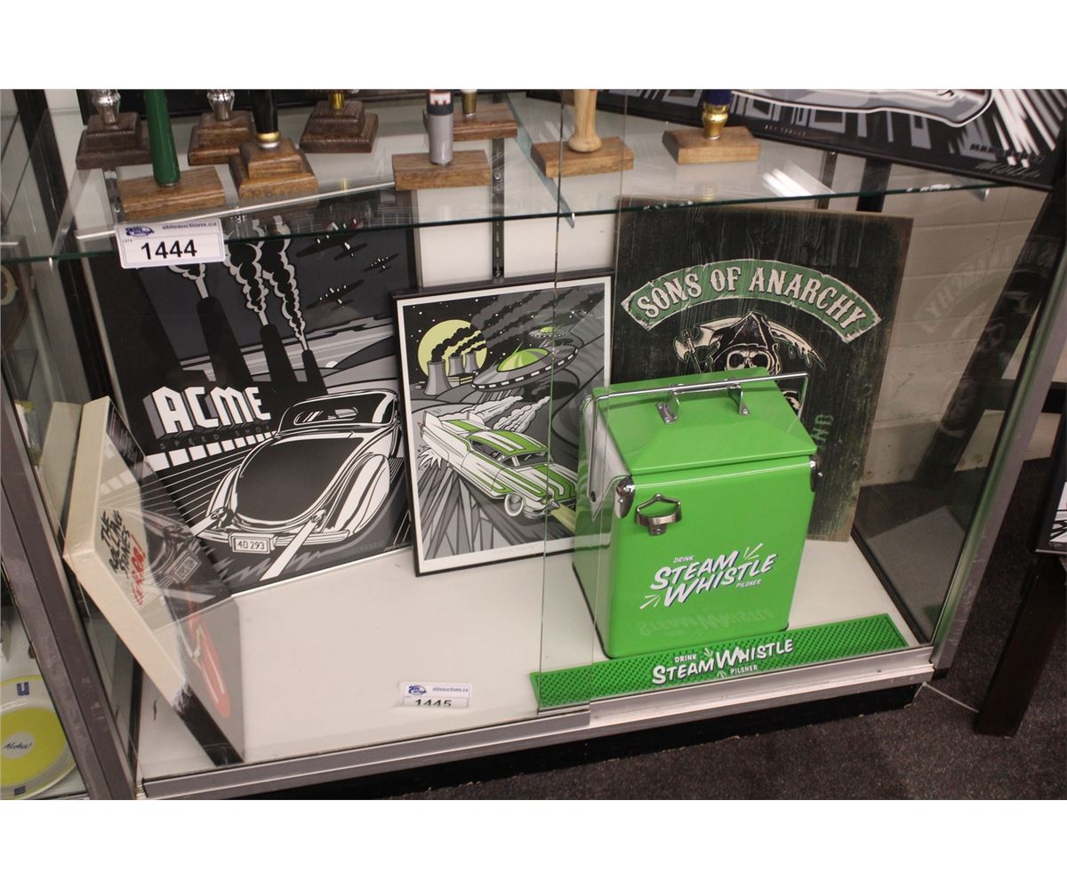 SHELF LOT OF MAX GRUNDY LIMITED EDITION ARTWORK, STEAM WHISTLE COOLER AND LIGHTUP SIGN