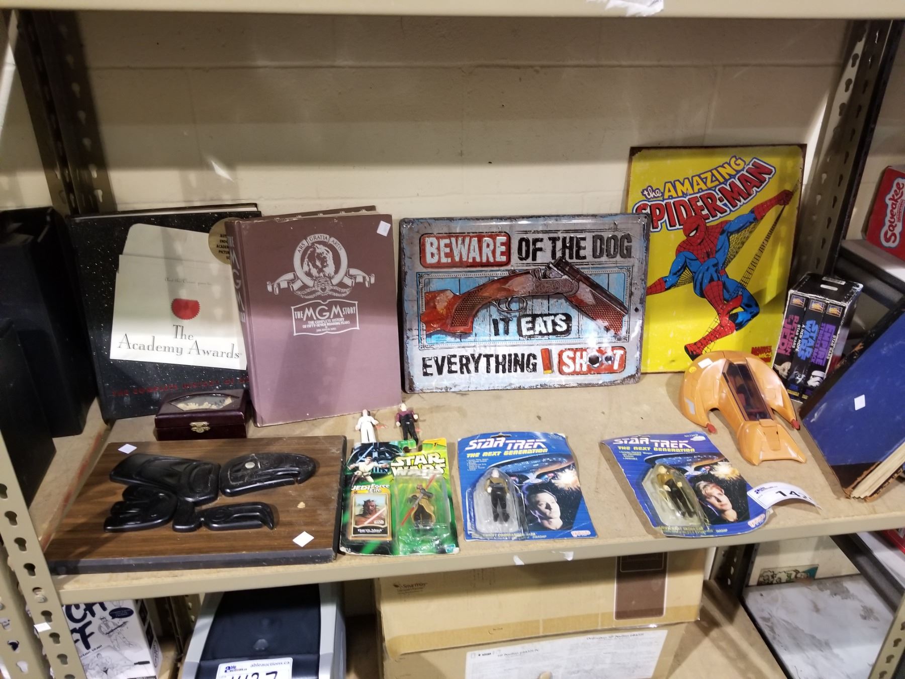SHELF LOT OF METAL SIGNS, STAR WARS FIGURES & MORE
