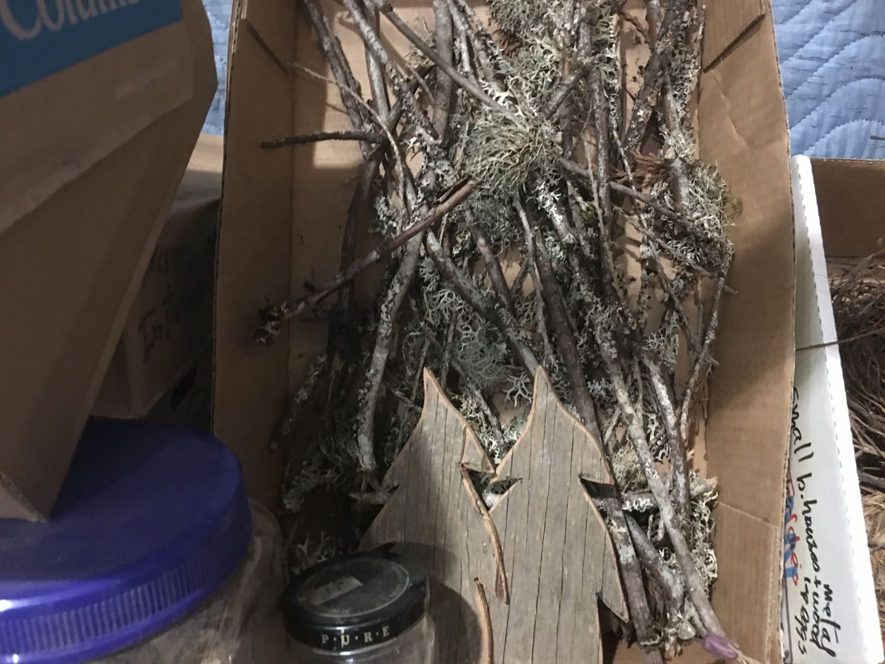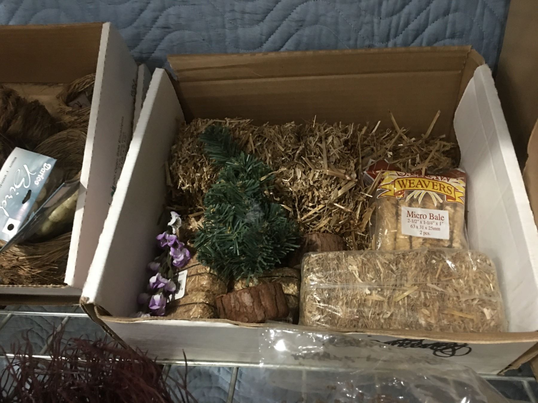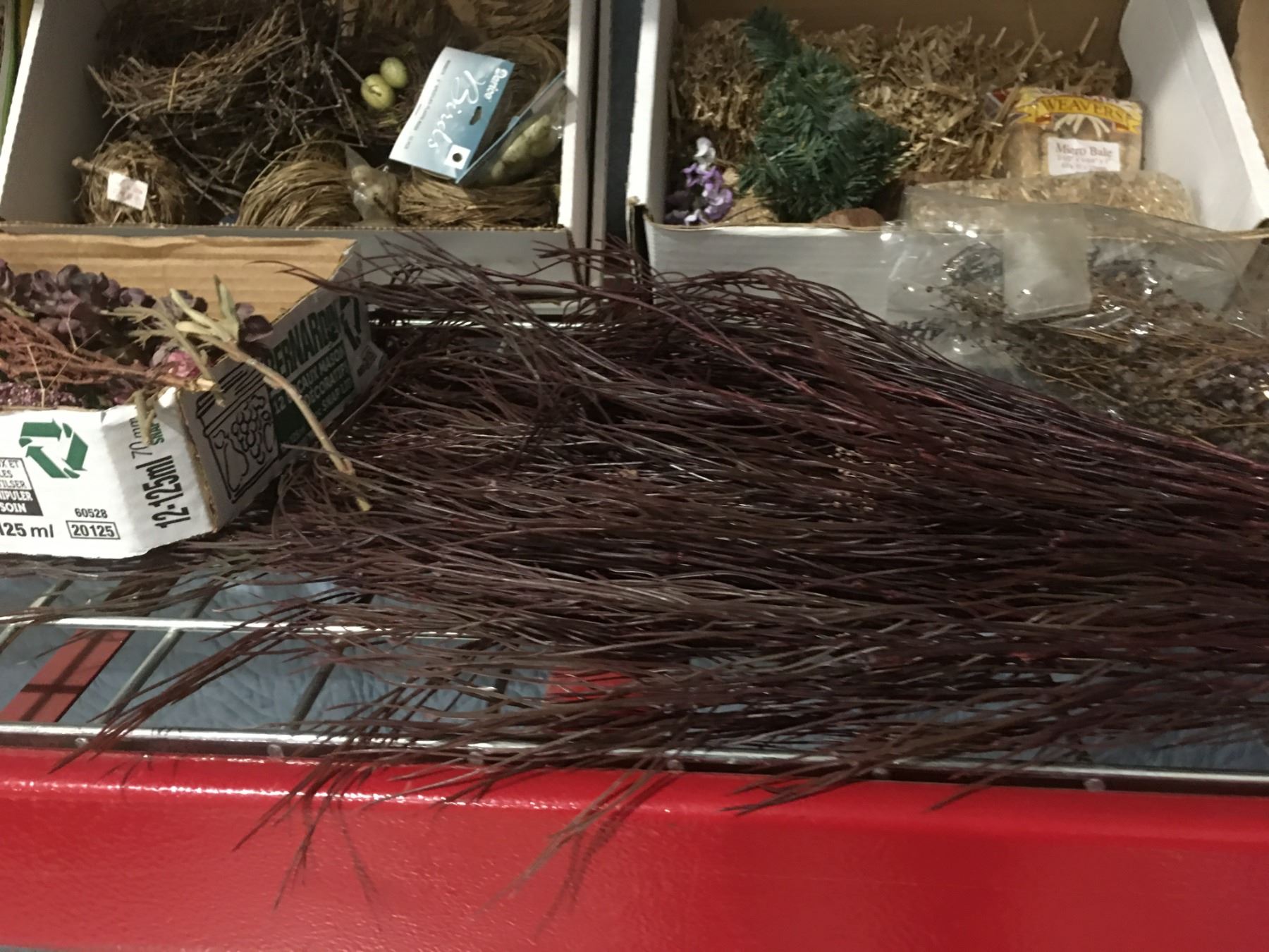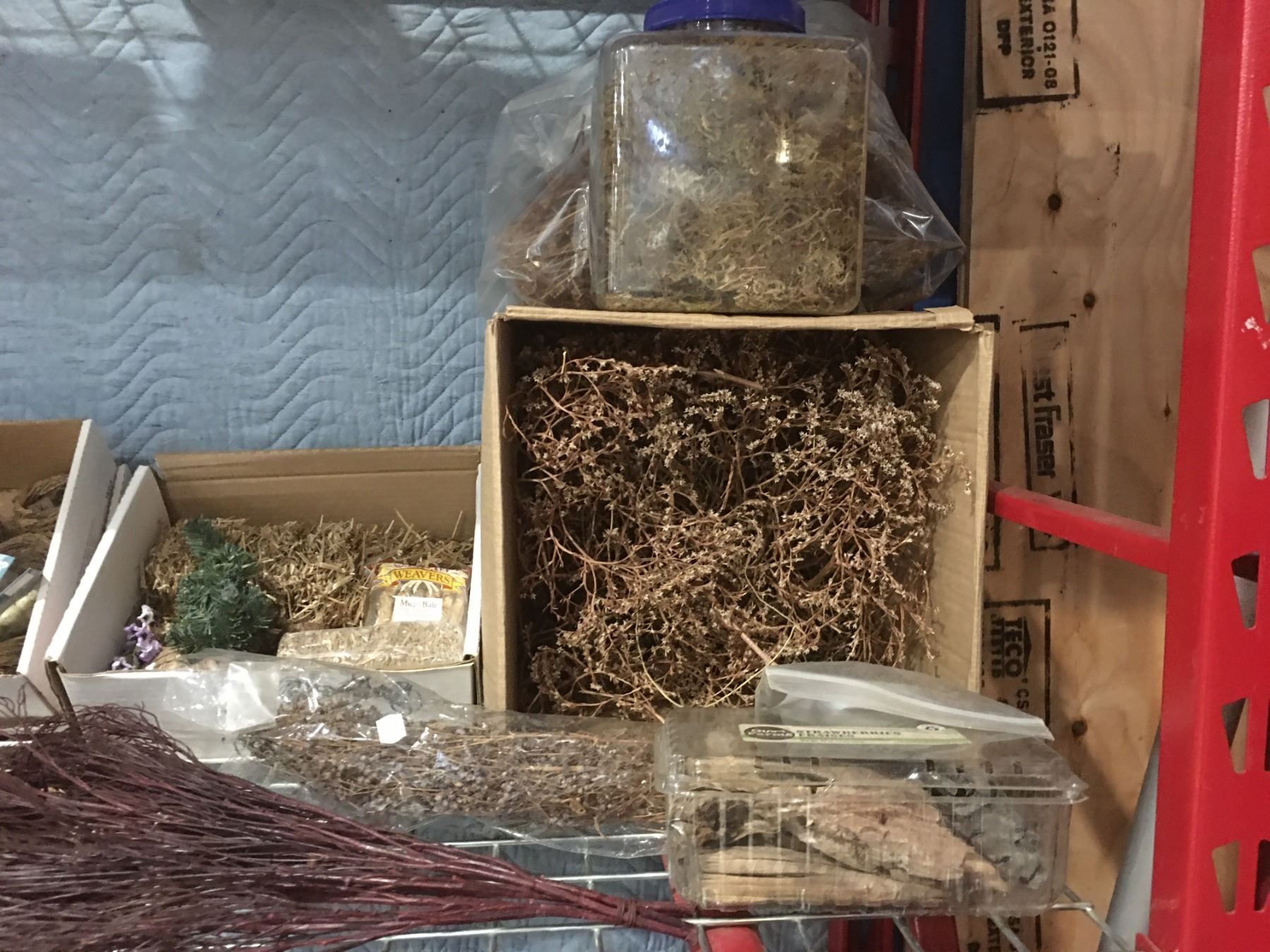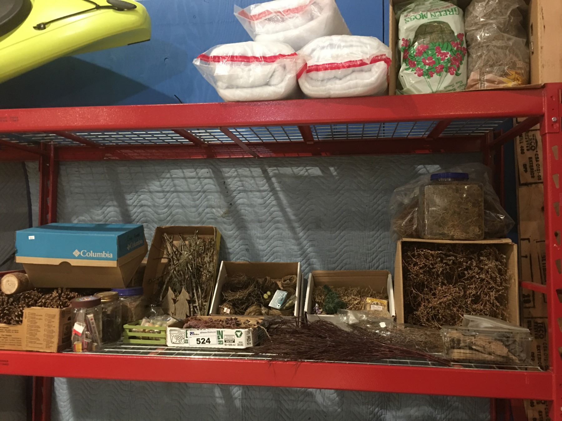 SHELF LOT OF MISC CRAFT SUPPLIES - PINE CONES/SNOW/MINIATURES/DRIED FLOWERS & MOSS
