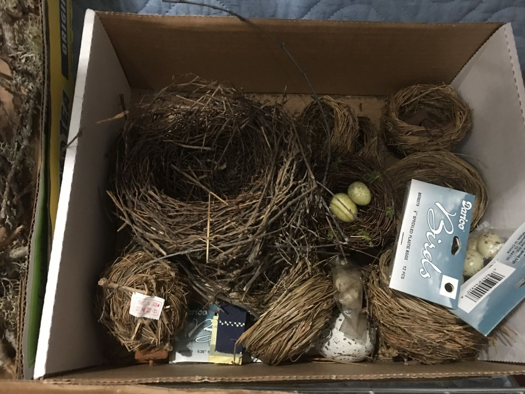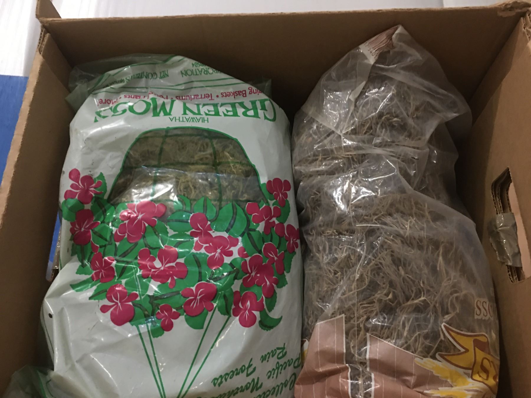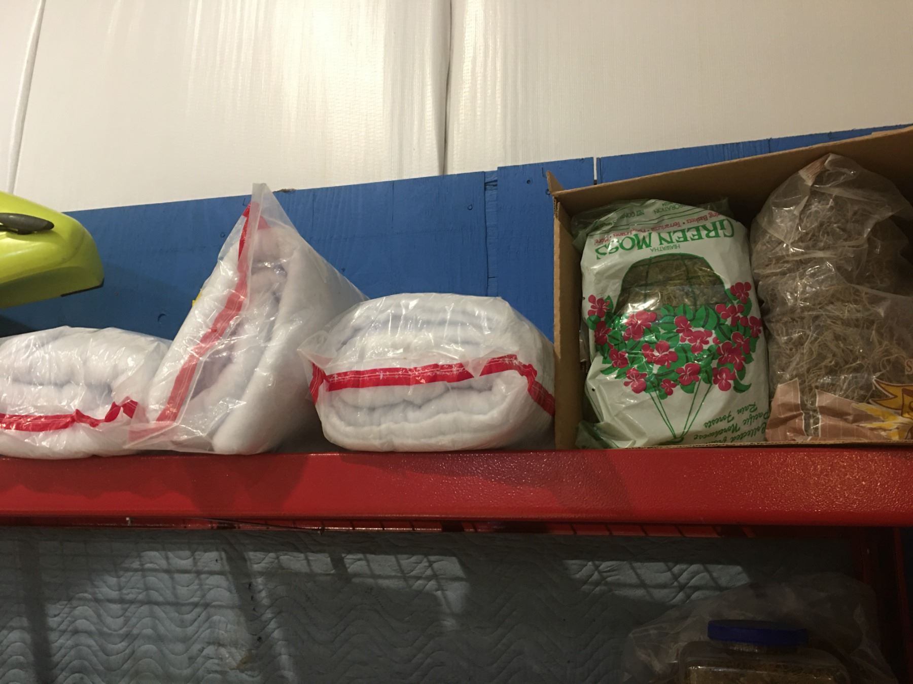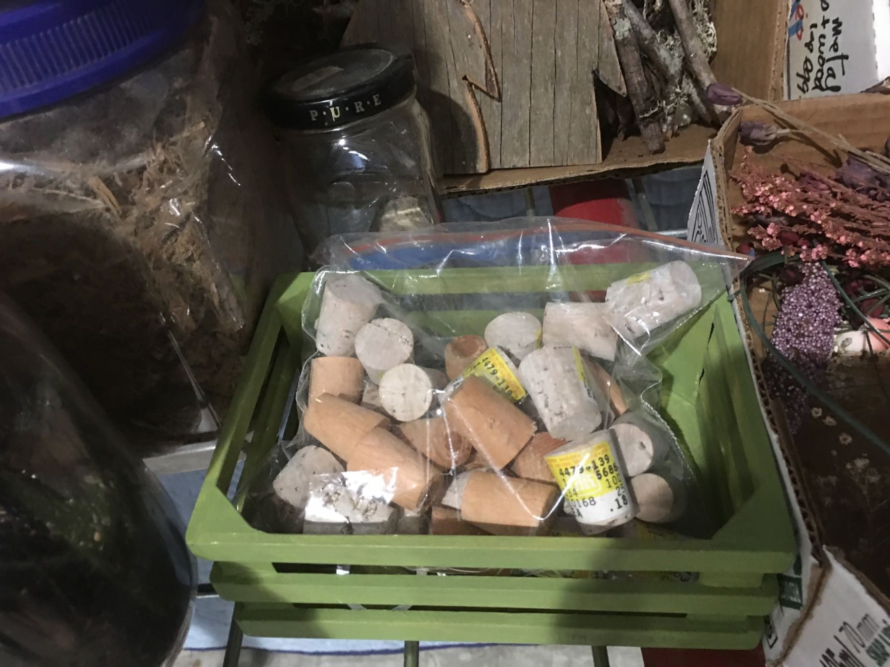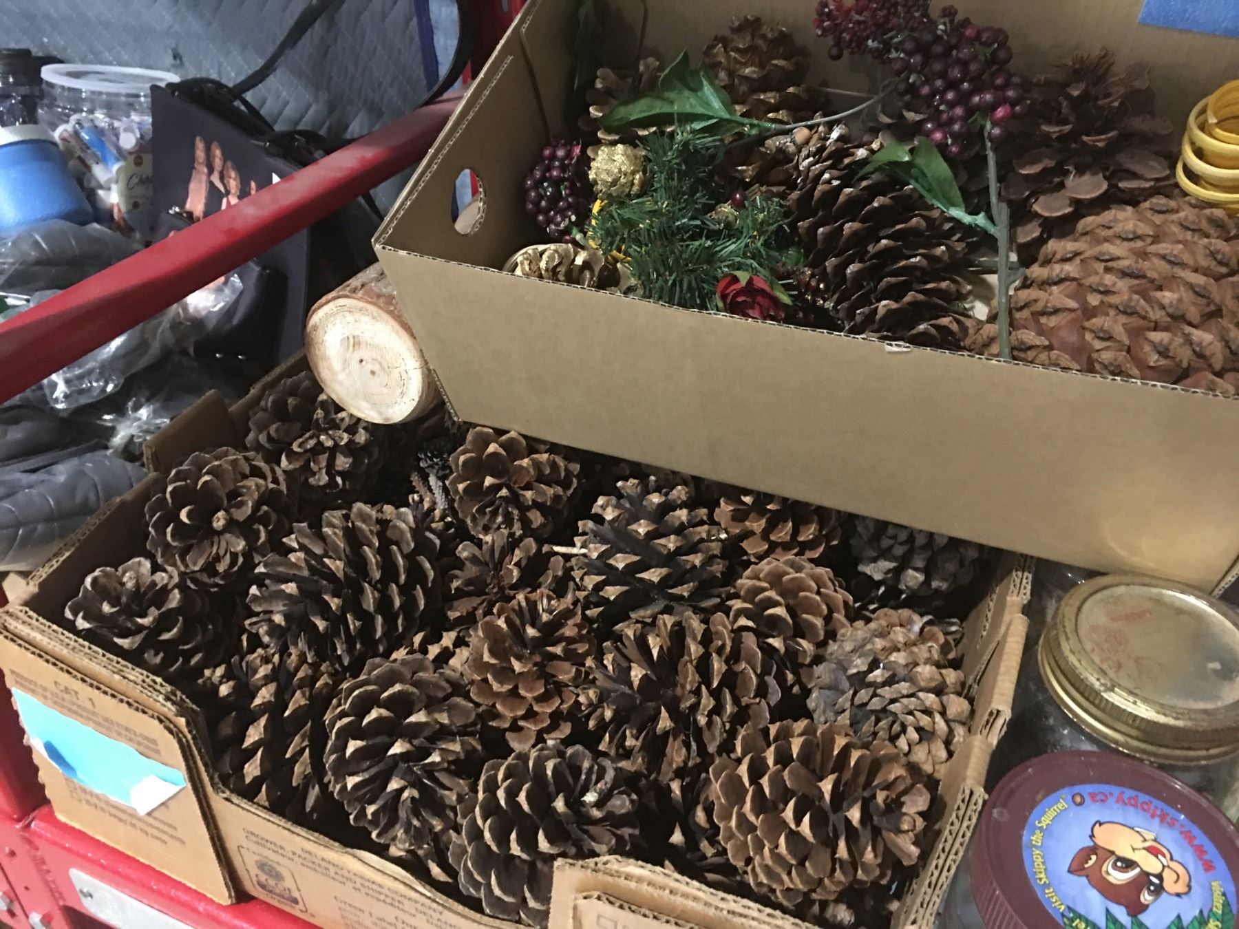 SHELF LOT OF MISC CRAFT SUPPLIES - PINE CONES/SNOW/MINIATURES/DRIED FLOWERS & MOSS