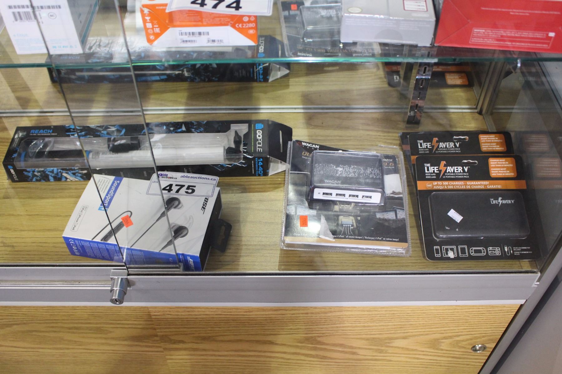 SHELF LOT OF MISC. ELECTRONICS - BOSE HEADSET, GO PRO ITEMS, BATTERIES, AND MORE