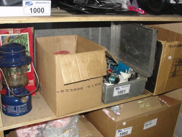 SHELF LOT OF MISC; FISHING REELS, FISHING TACKLE, COLEMAN LANTERN, ETC