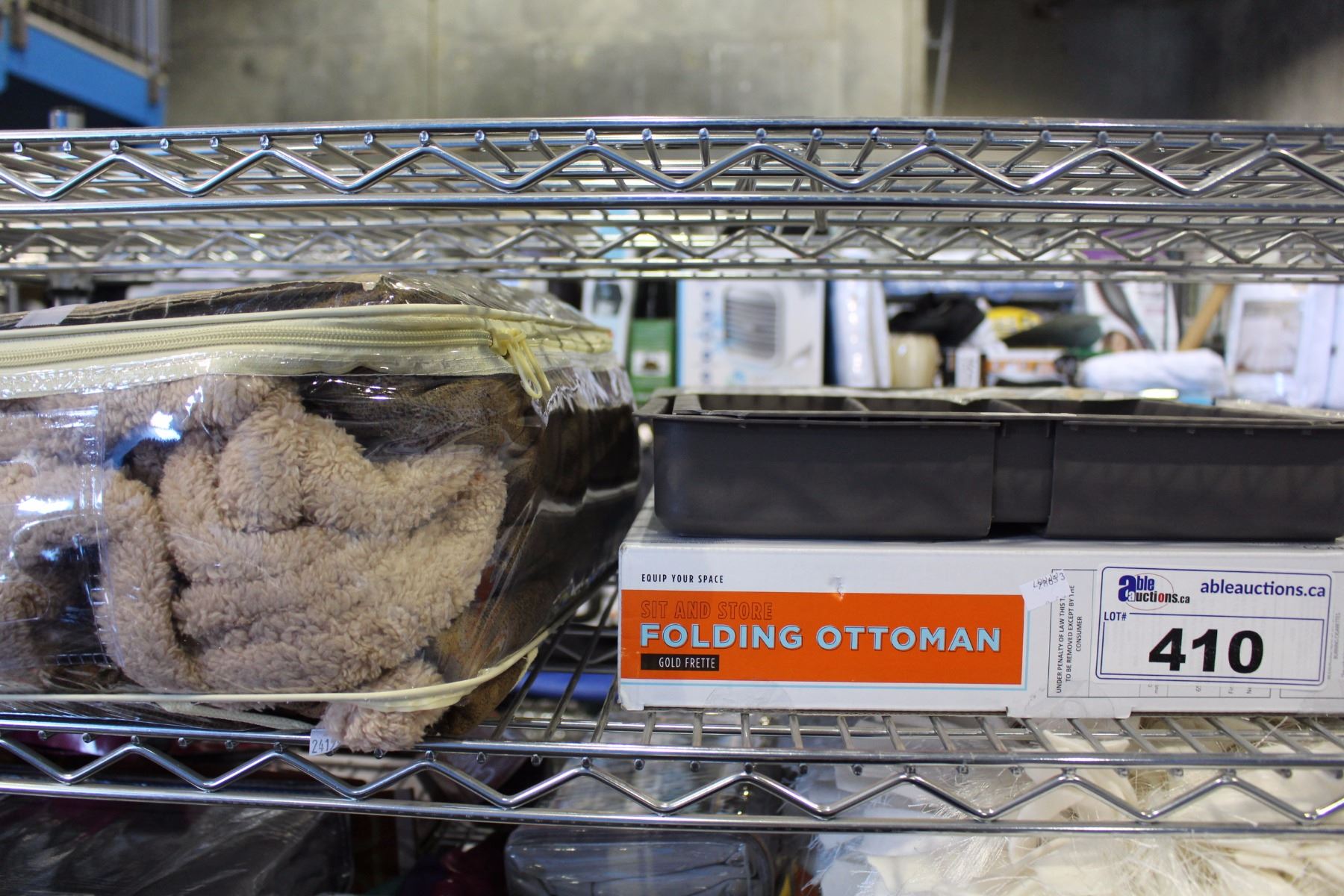 SHELF LOT OF MISC HOME PRODUCTS INCLUDING EQUIP YOUR SPACE FOLDING OTTOMAN, SUREFIT SOFA COVER AND MORE