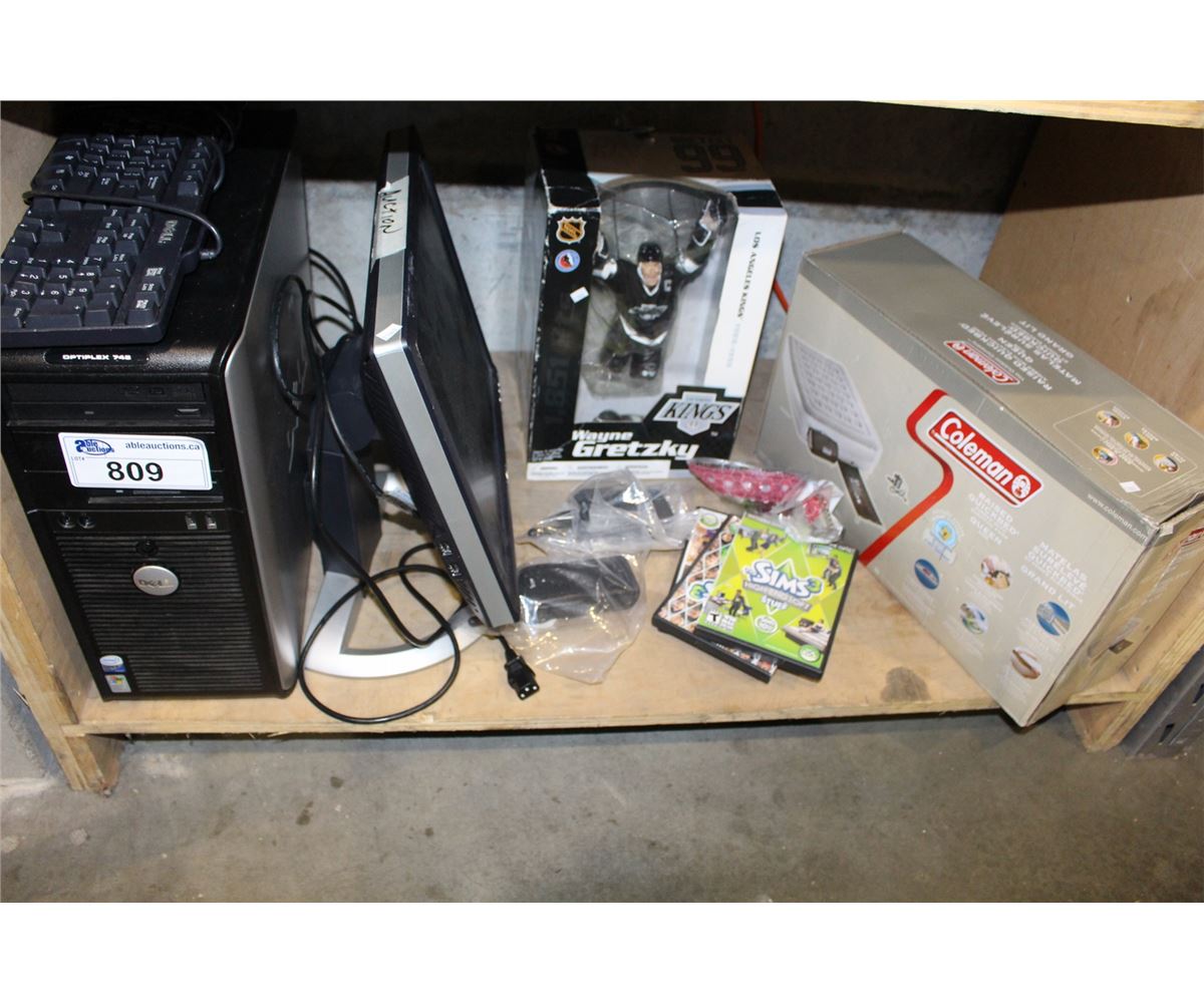 SHELF LOT OF MISC ITEMS; COLEMAN BLOW UP MATTRESS, DELL COMPUTER, COMPUTER GAMES, ETC