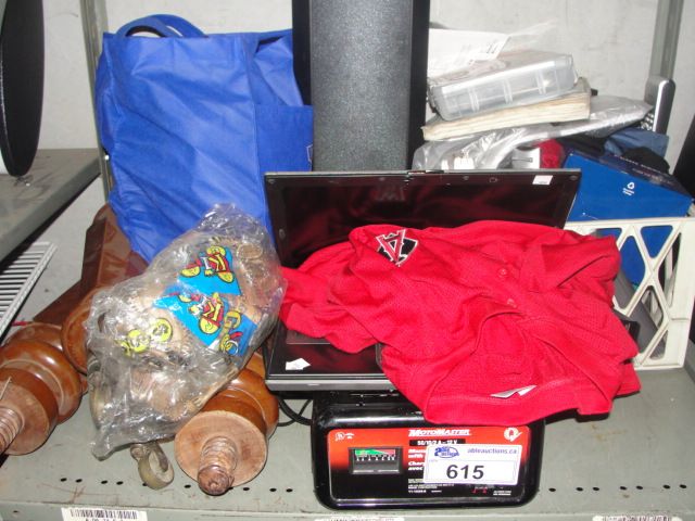 SHELF LOT OF MISC ITEMS; DELL LAPTOP COMPUTER, ANTIQUE PIANO LEGS, BATTERY CHARGER ETC