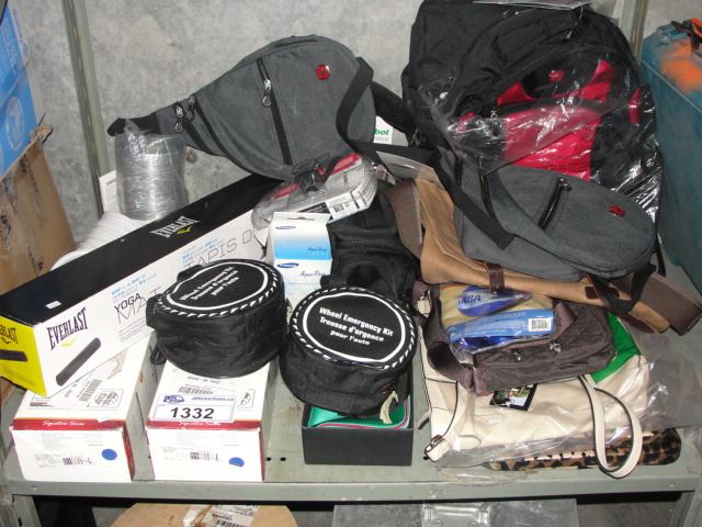 SHELF LOT OF MISC ITEMS; EXERCISE, YOGA MAT, ASSORTED BACK PACKS AND HAND BAGS ETC