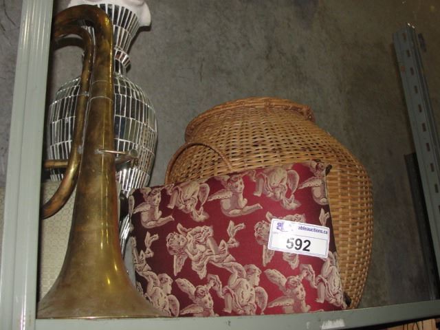 SHELF LOT OF MISC ITEMS INCLUDING BRASS HORN, VASE, WICKER BASKET ETC