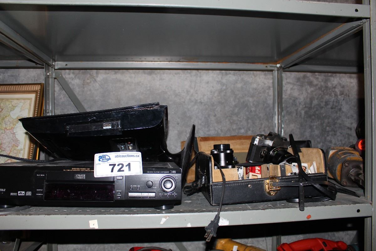 SHELF LOT OF MISC ITEMS INCLUDING; CAMERA, DVD PLAYER AND MONITOR