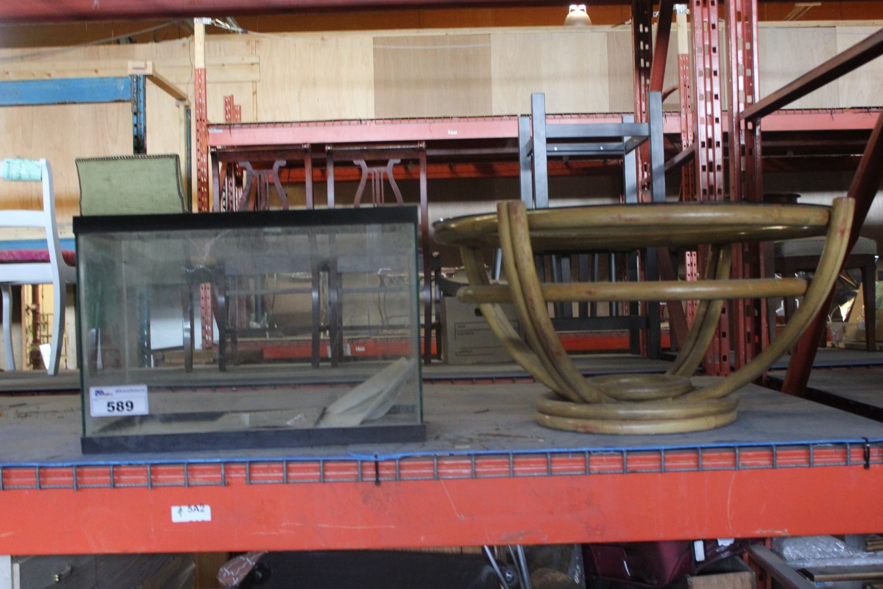 SHELF LOT OF MISC ITEMS INCLUDING COFFEE TABLE, FISH TANK AND MORE