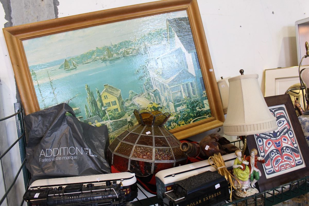 SHELF LOT OF MISC ITEMS; NATIVE ITEMS, POLAR EXPRESS LAMPS, AND MORE