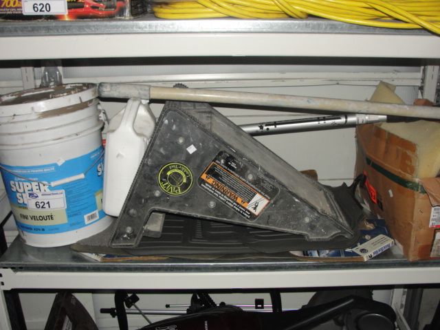 SHELF LOT OF MISC ITEMS; PAINTERS SUPPPLIES, AUTO MOBILE FLOOR MATS, ETC