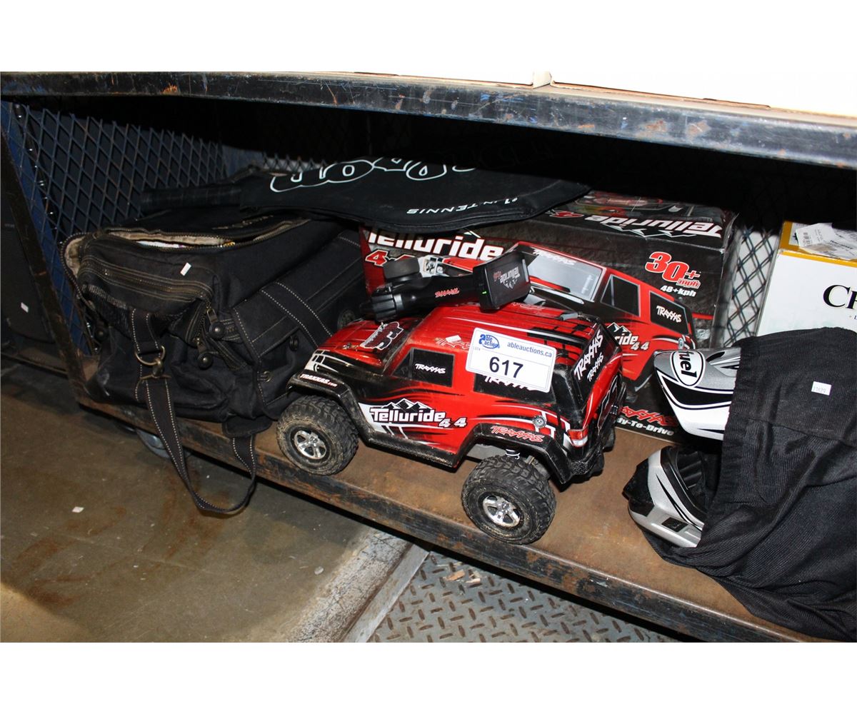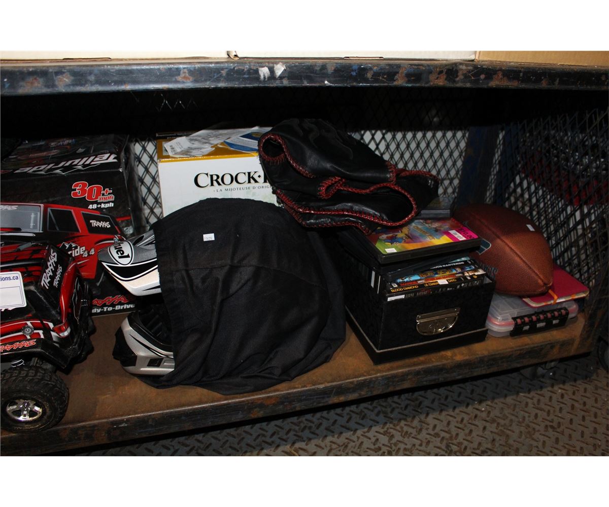 SHELF LOT OF MISC ITEMS; RADIO CONTROLLED TRUCK, MOTORCYCLE HELMET, DVDS ETC
