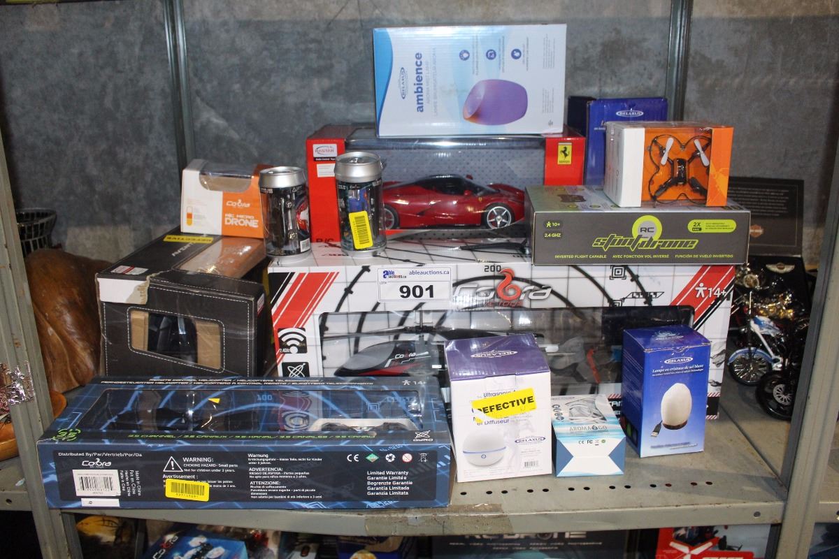 SHELF LOT OF MISC RADIO CONTROLLED CARS AND HELICOPTERS INCLUDING OTHER ITEMS