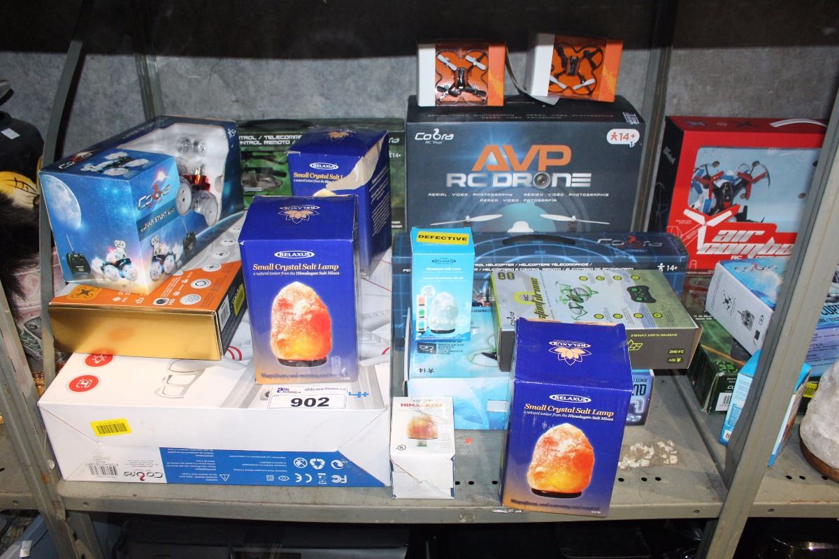 SHELF LOT OF MISC RADIO CONTROLLED CARS AND HELICOPTERS INCLUDING OTHER ITEMS