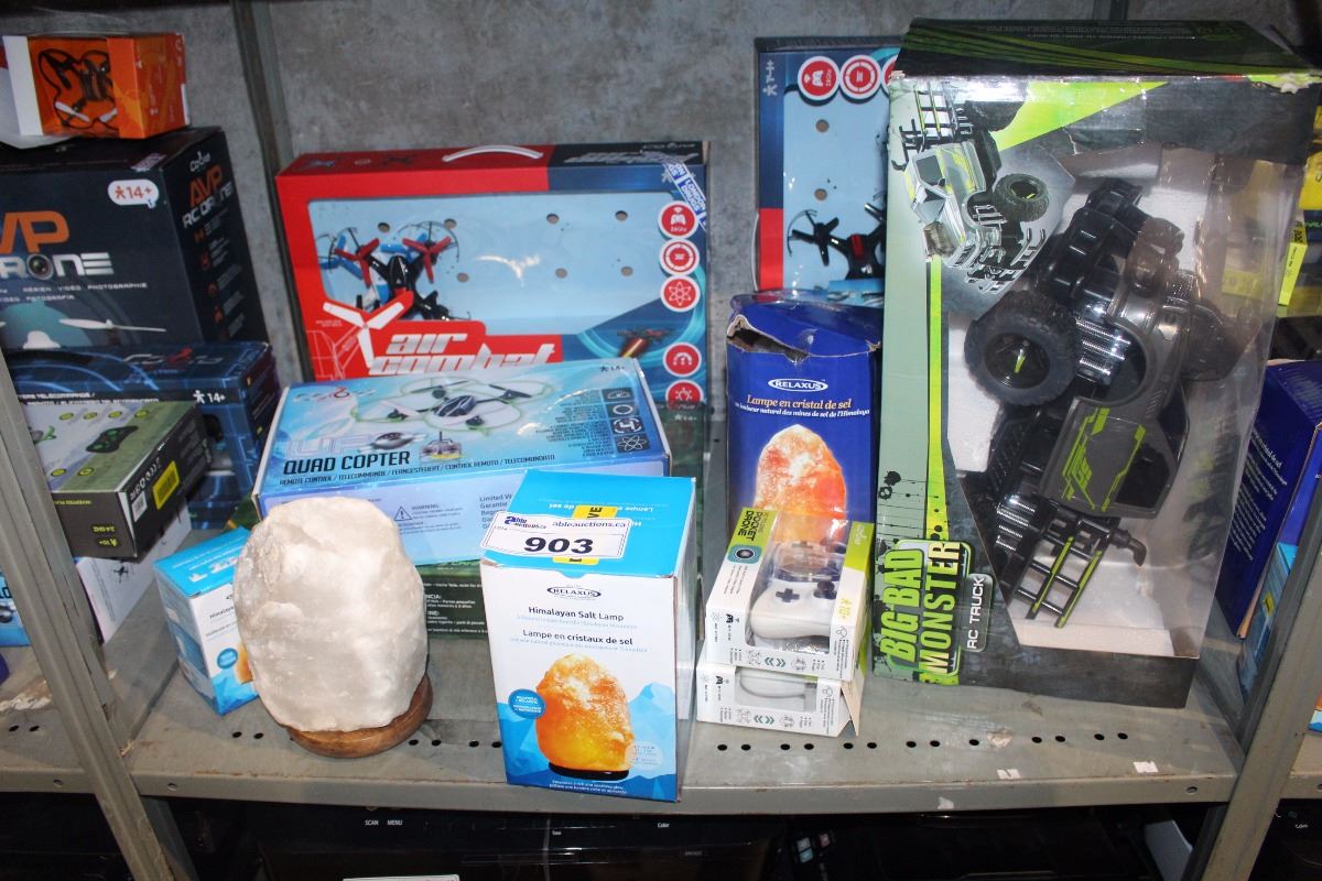 SHELF LOT OF MISC RADIO CONTROLLED CARS AND HELICOPTERS INCLUDING OTHER ITEMS