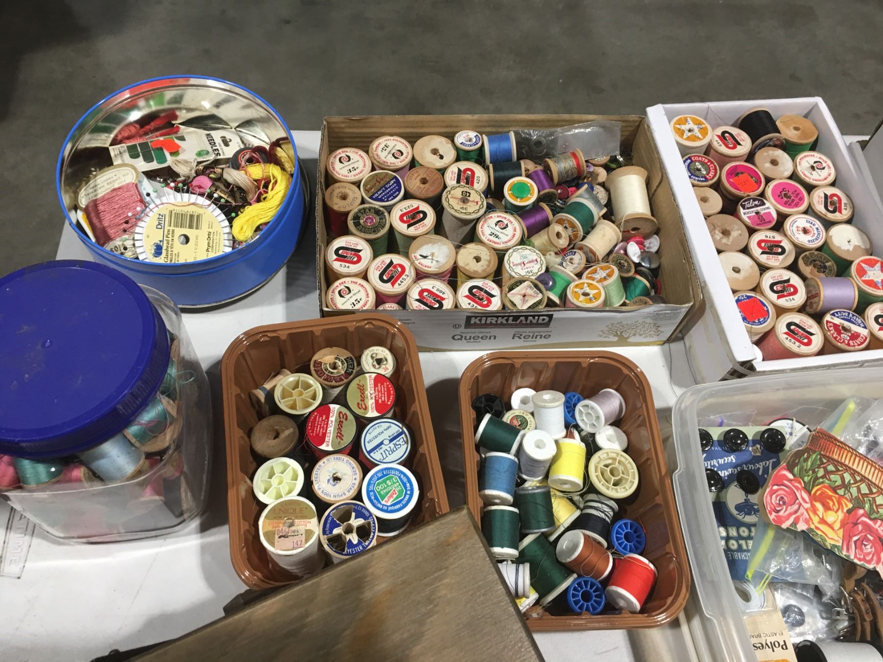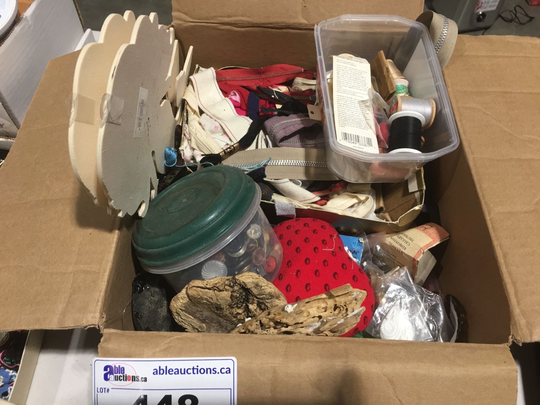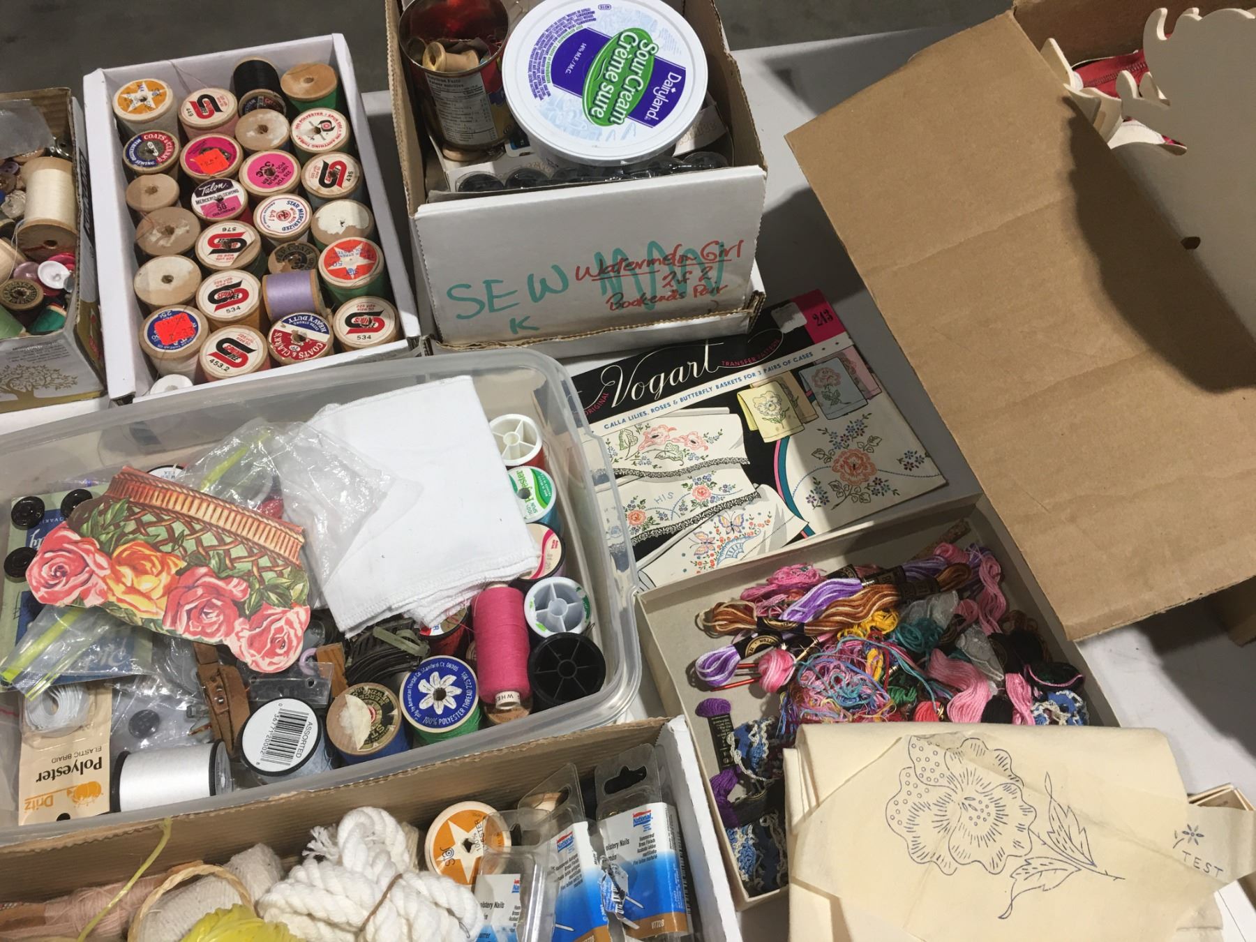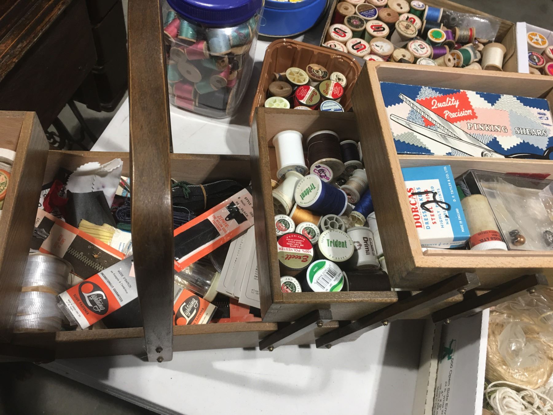 SHELF LOT OF MISC SEWING ACCESSORIES INCL: THREAD/ZIPPERS/BUTTONS/STENCILS/NEEDLE POINT THREAD/SMALL SEWING BASKET/PINKING SHEARS ETC.