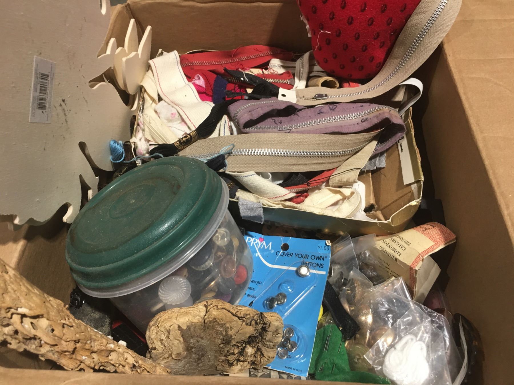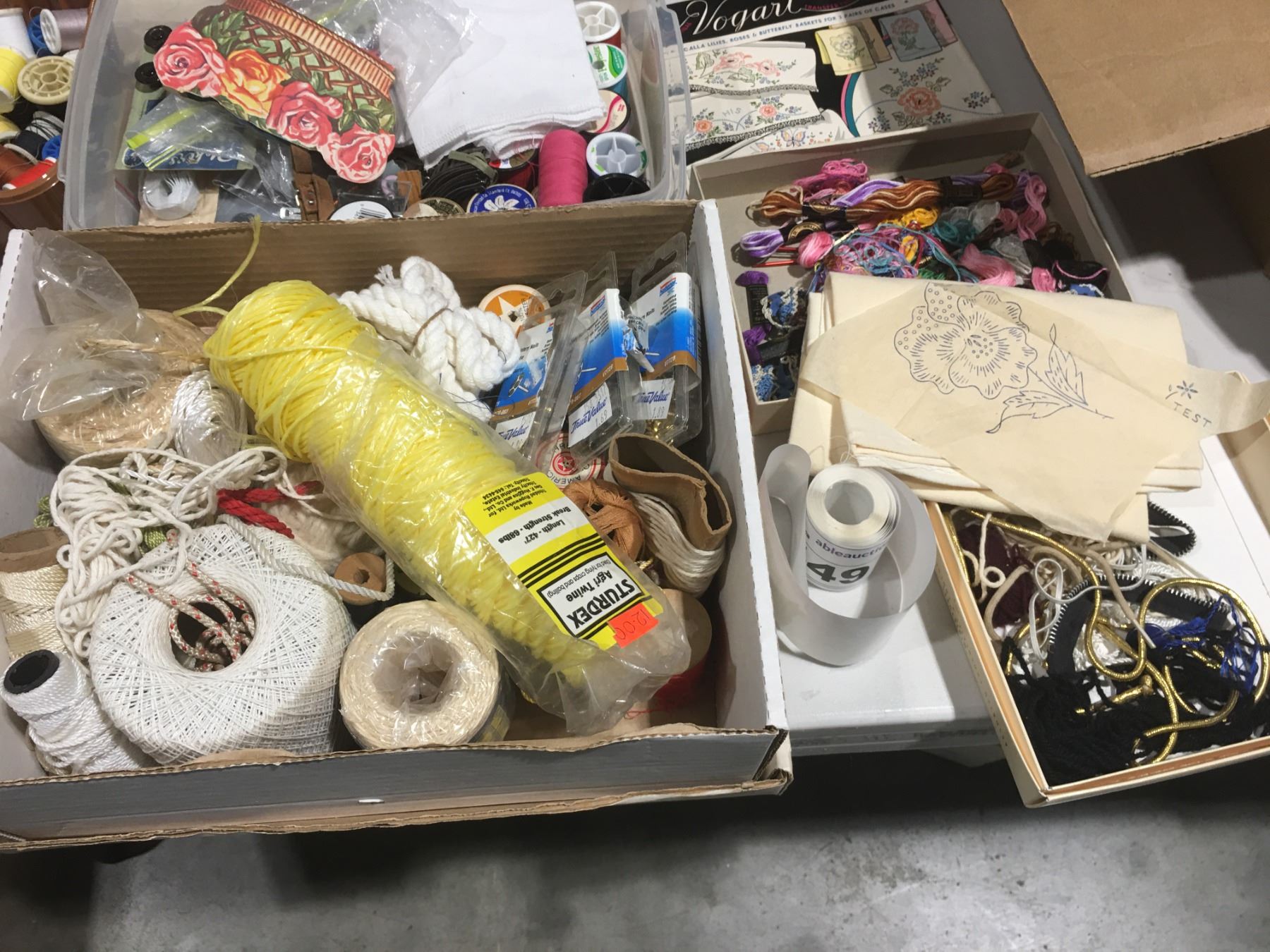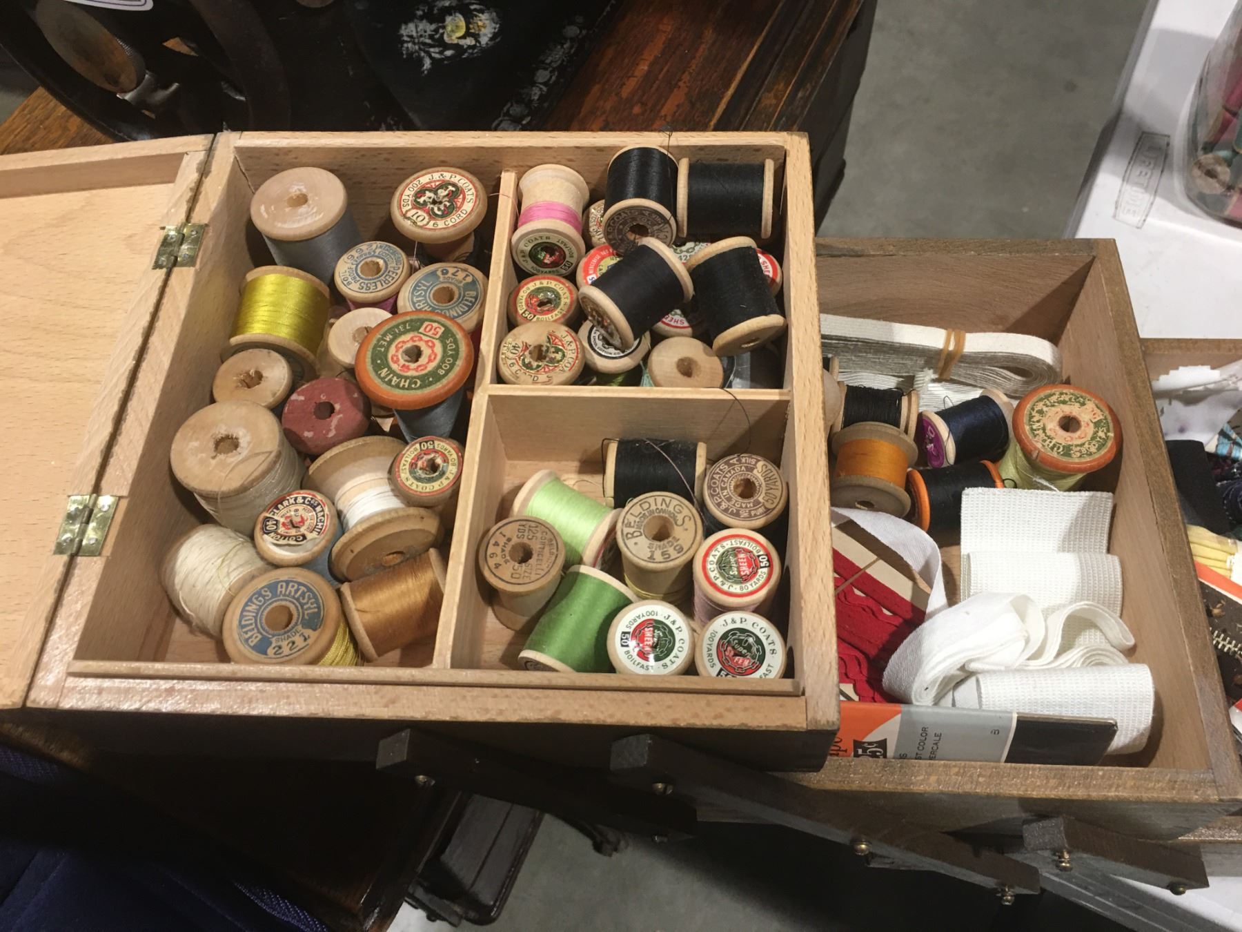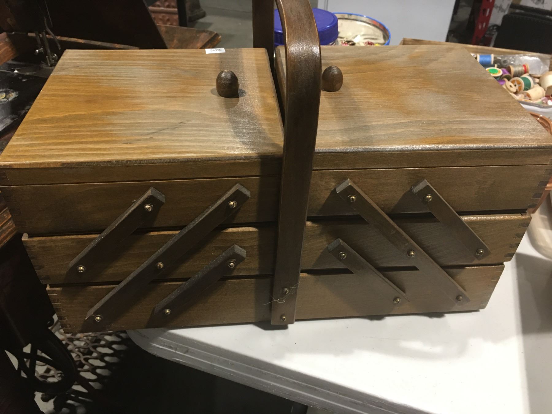 SHELF LOT OF MISC SEWING ACCESSORIES INCL: THREAD/ZIPPERS/BUTTONS/STENCILS/NEEDLE POINT THREAD/SMALL SEWING BASKET/PINKING SHEARS ETC.