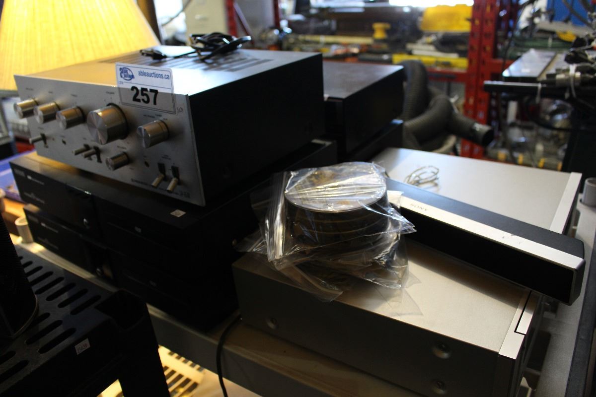 SHELF LOT OF MISC STEREO COMPONENTS