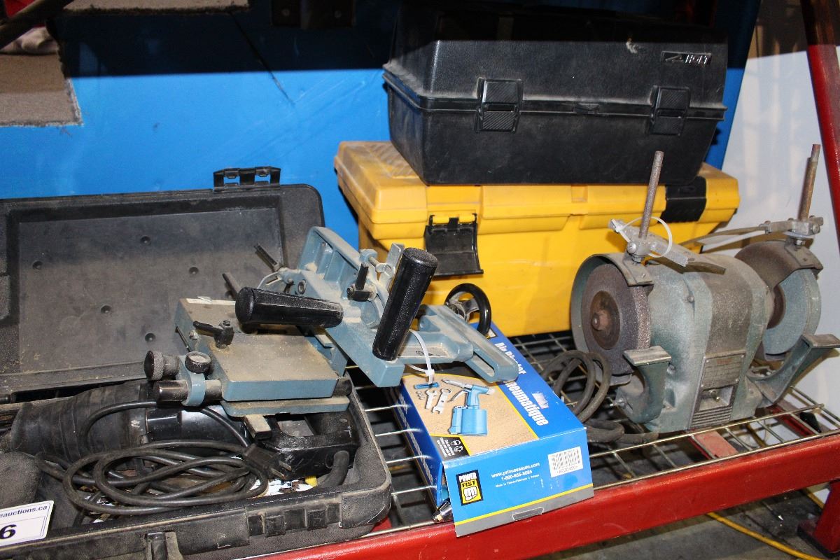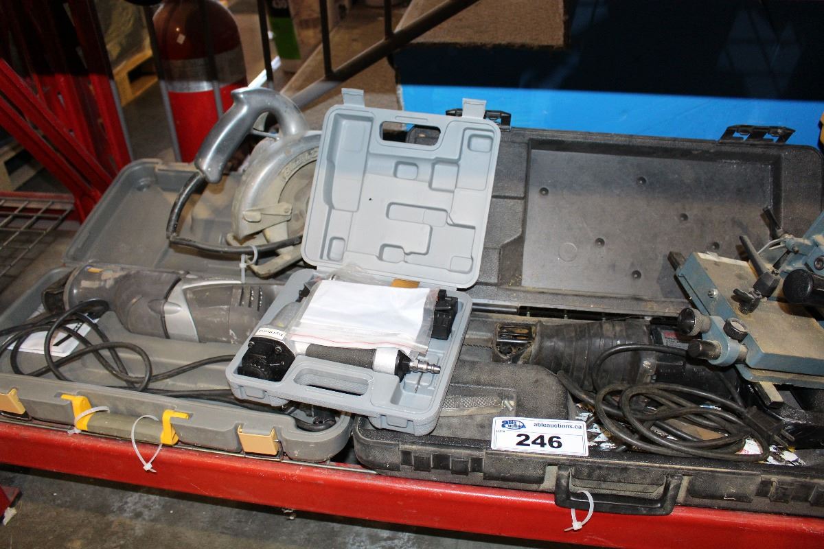 SHELF LOT OF MISC TOOLS; RECIPROCATING SAWS, GRINDERS, CIRCULAR SAW AND MORE