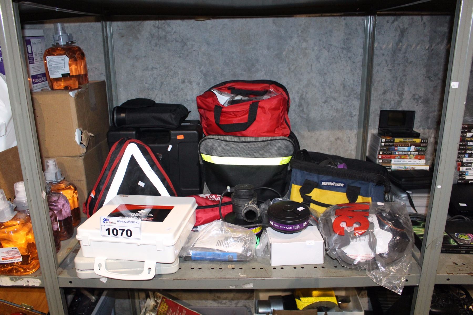 SHELF LOT OF MISC TOOLS, RESPIRATOR AND MORE