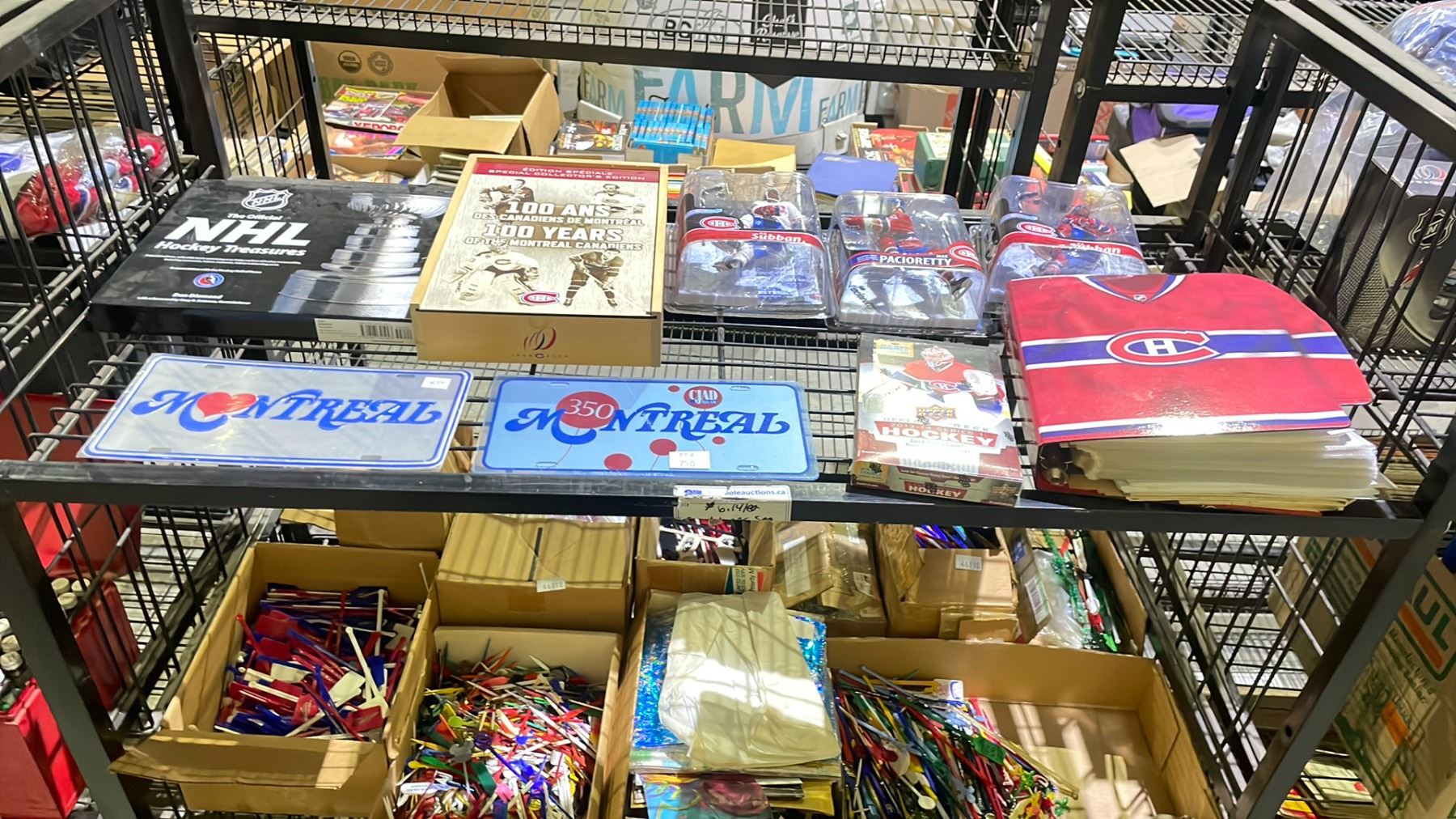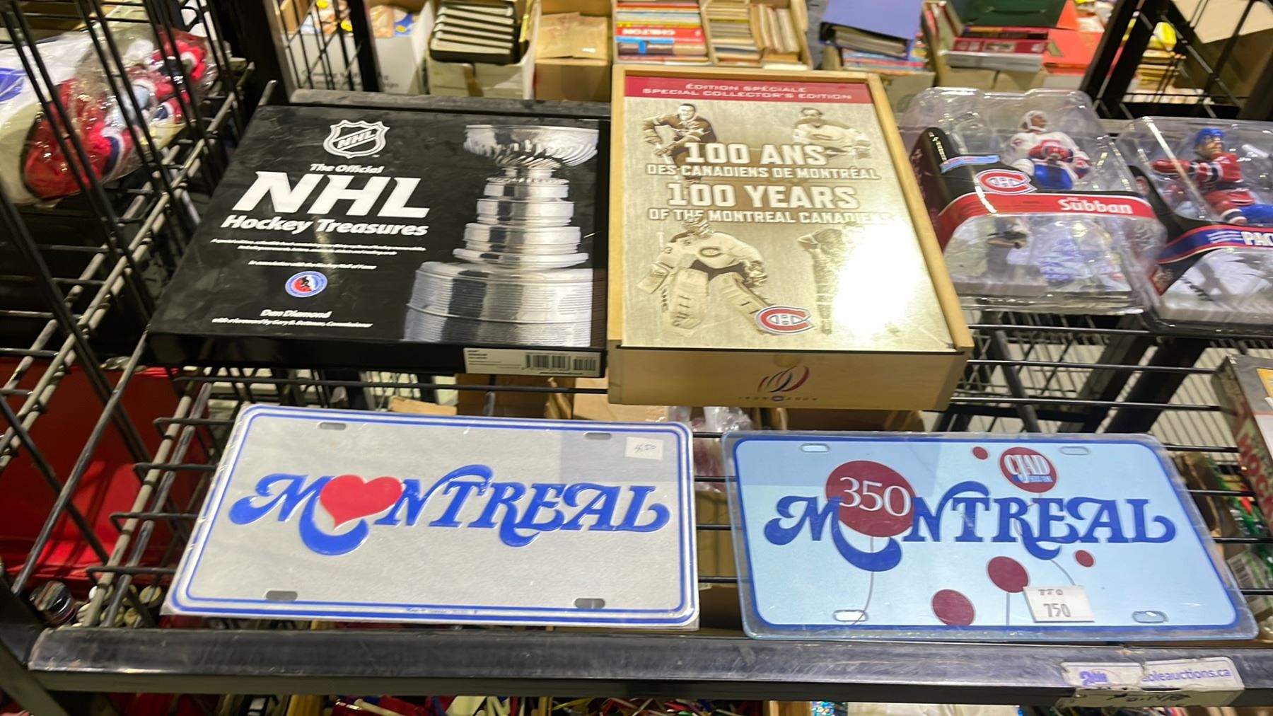 SHELF LOT OF MONTREAL CANADIANS FIGURINES, HOCKEY CARDS, AND MORE