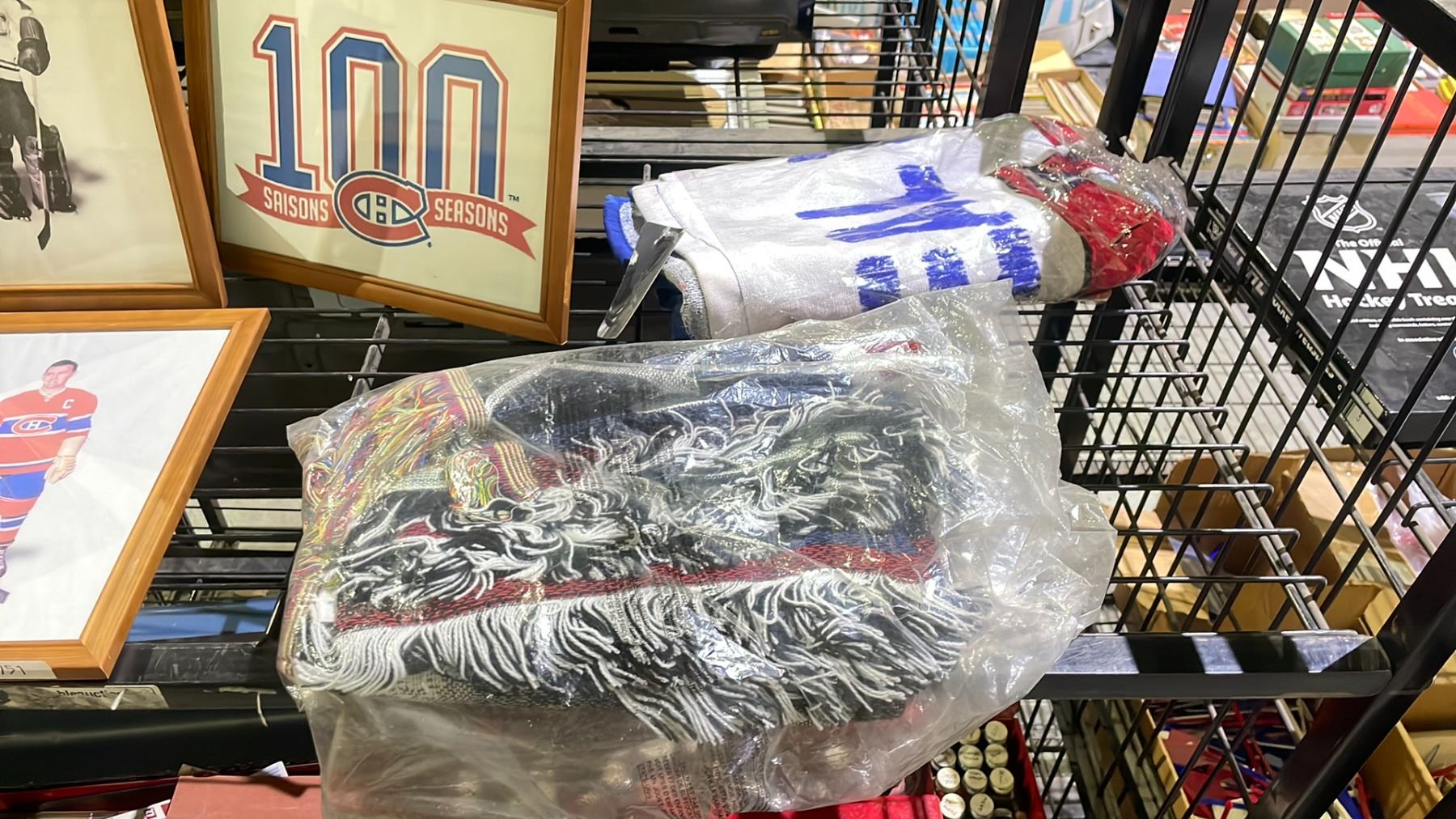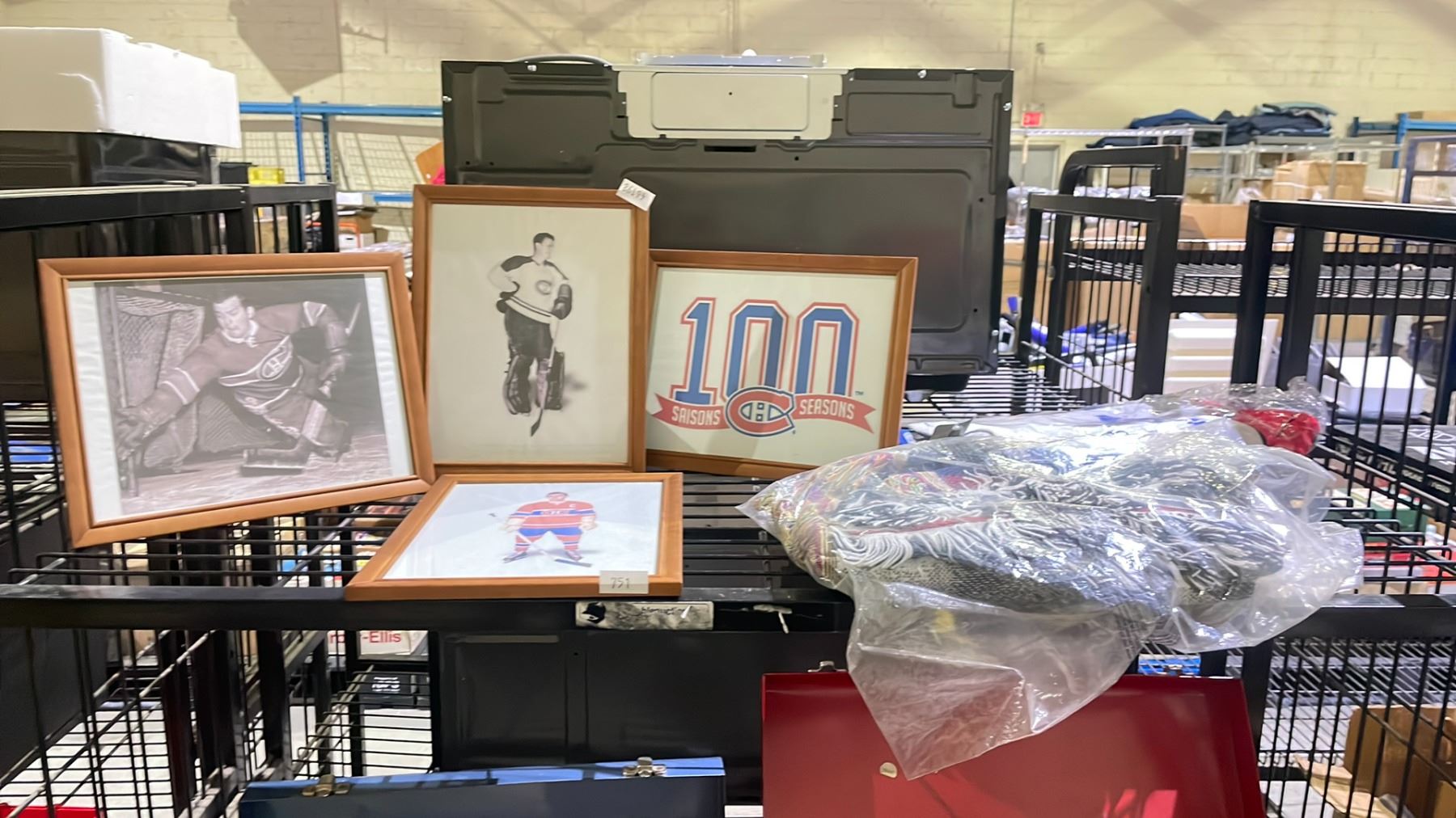 SHELF LOT OF MONTREAL CANADIANS FRAMED PRINT OUT PICTURES, SCARF AND MORE