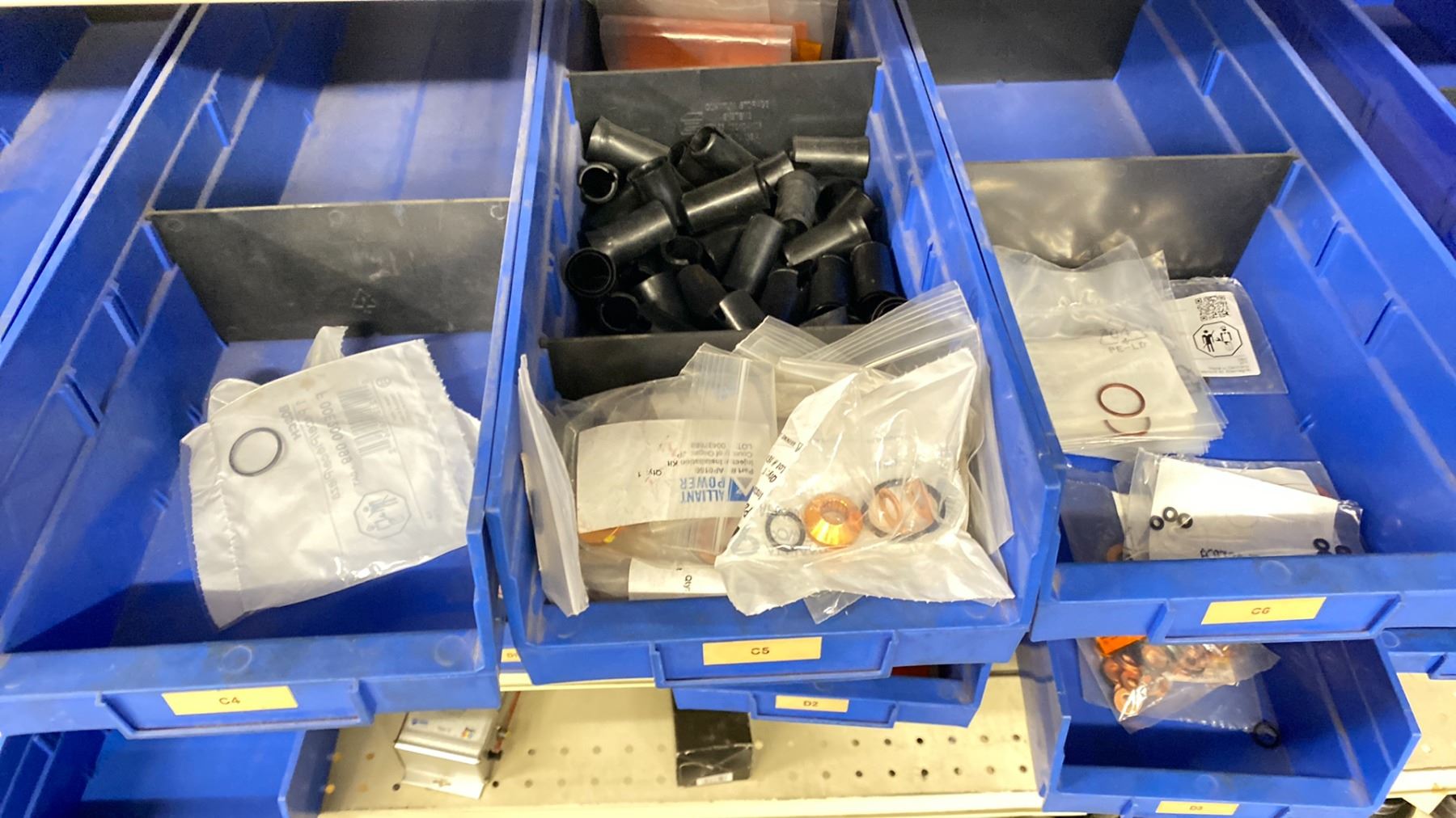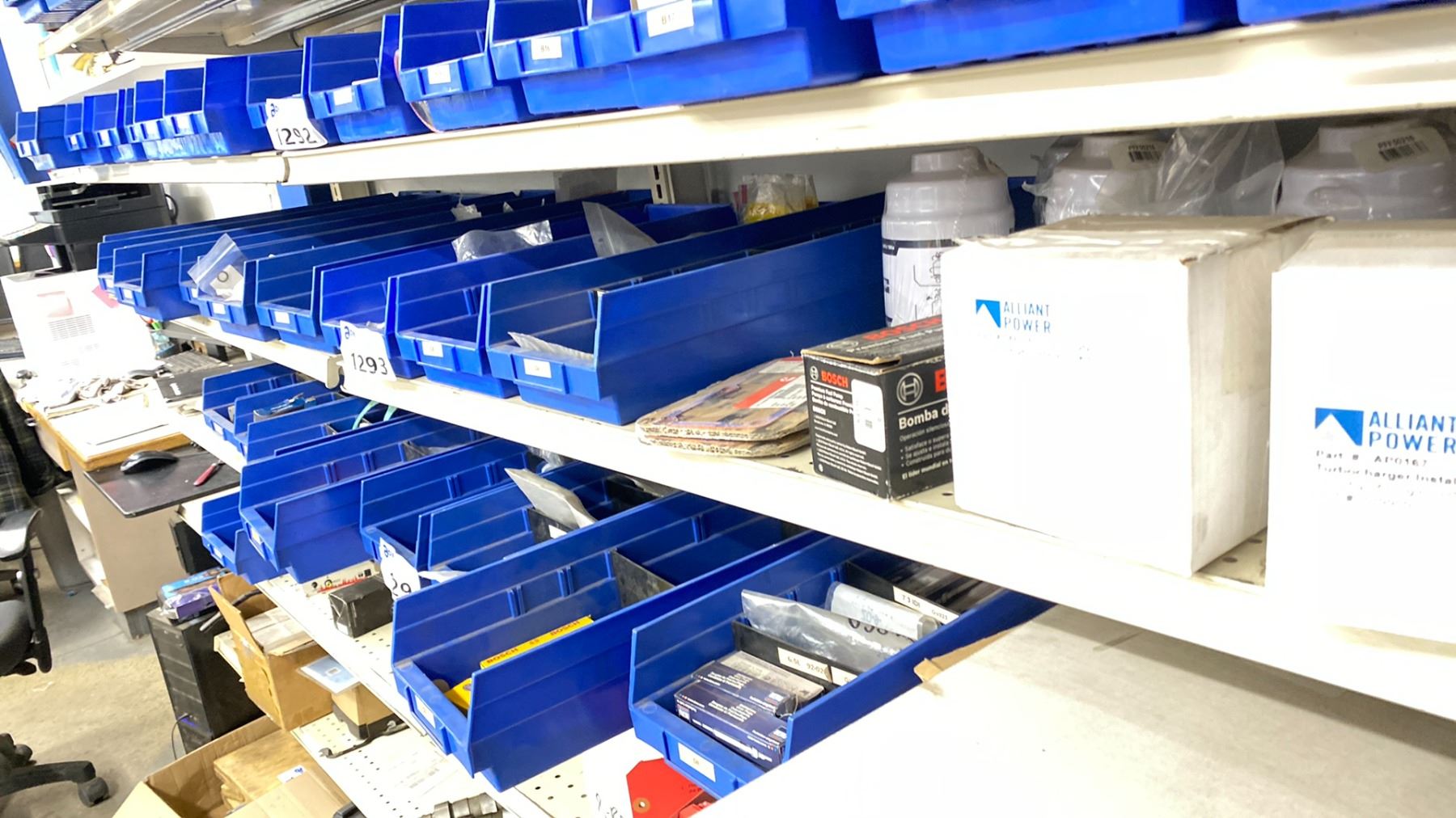 SHELF LOT OF MOSTLY ALLIANT POWER BRAND AUTOMOTIVE PARTS. SEAL KITS, GASKETS, TURBOCHARGER INSTALL KITS, FUEL PUMP, MOUNTING KITS, WATER SEPARATORS ETC