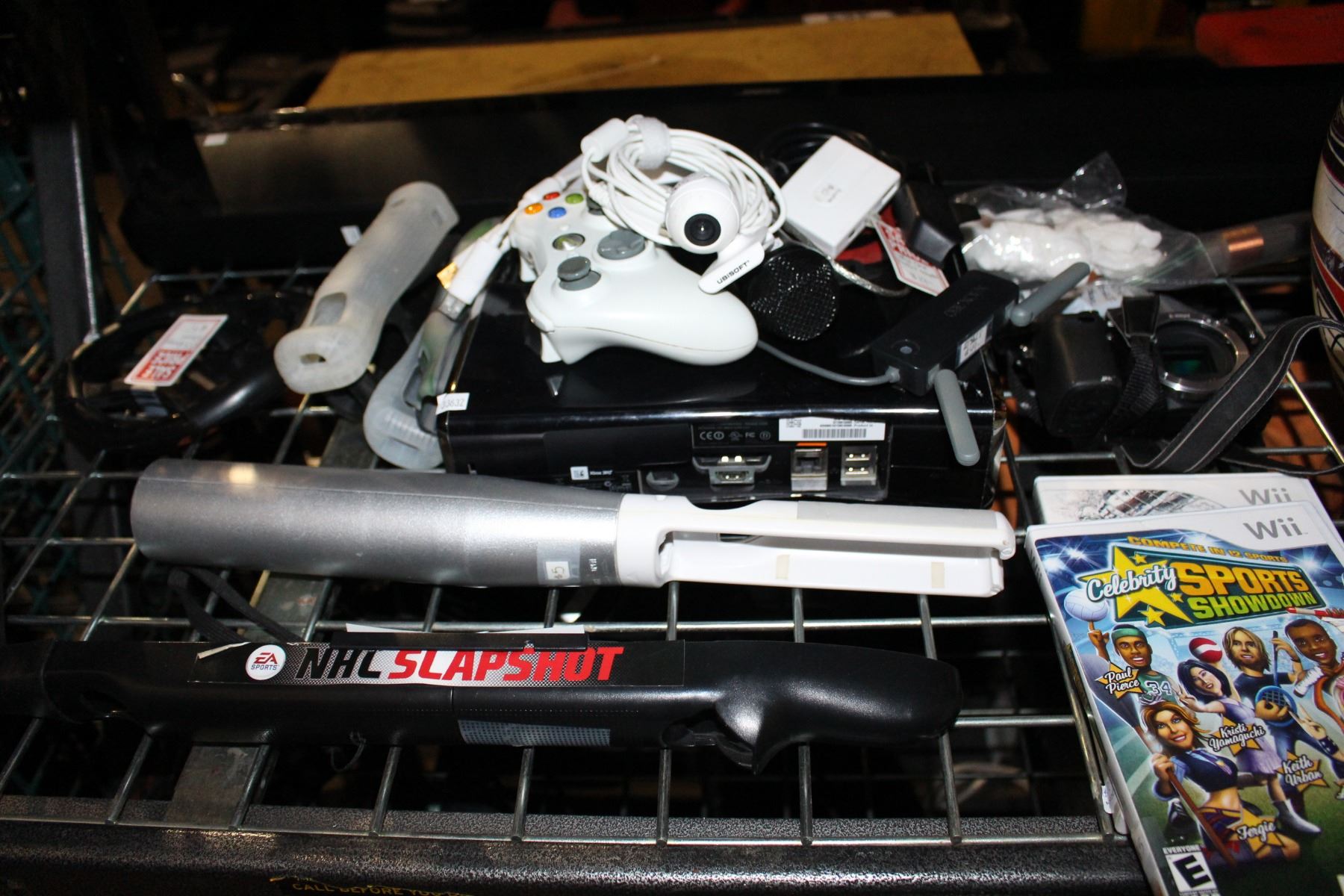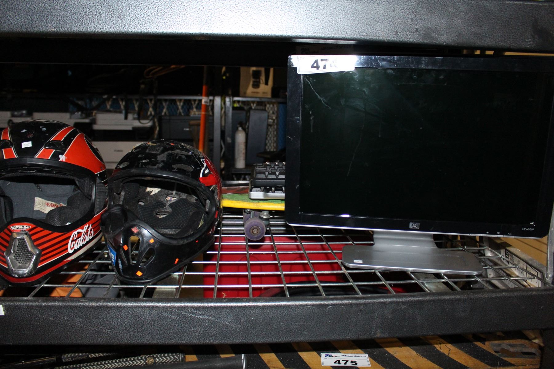 SHELF LOT OF MOTOCROSS HELMETS, MONITOR AND MORE
