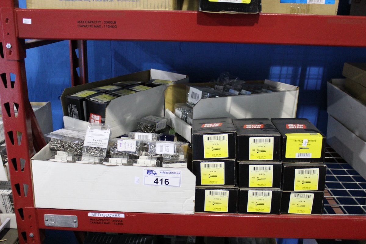 SHELF LOT OF NEW BOXED ASSORTED FASTENERS - LAG BOLTS/ SHEET METAL SCREWS ECT.