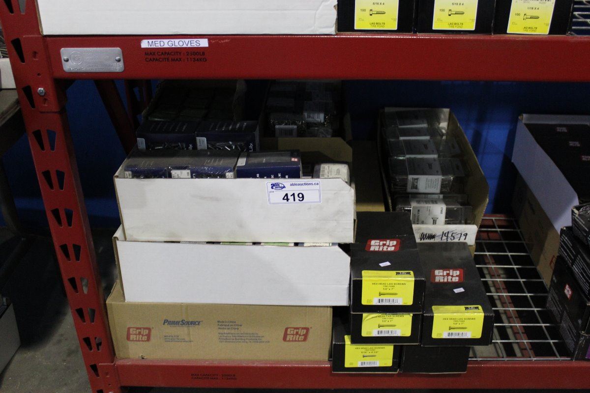SHELF LOT OF NEW BOXED ASSORTED FASTENERS -MULTI USE STAINLESS STEEL SCREWS/ LAG SCREWS ECT.