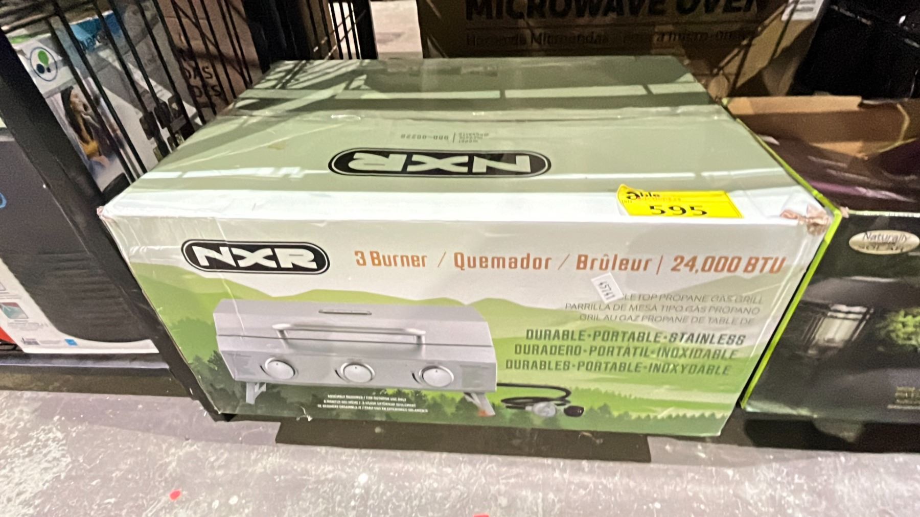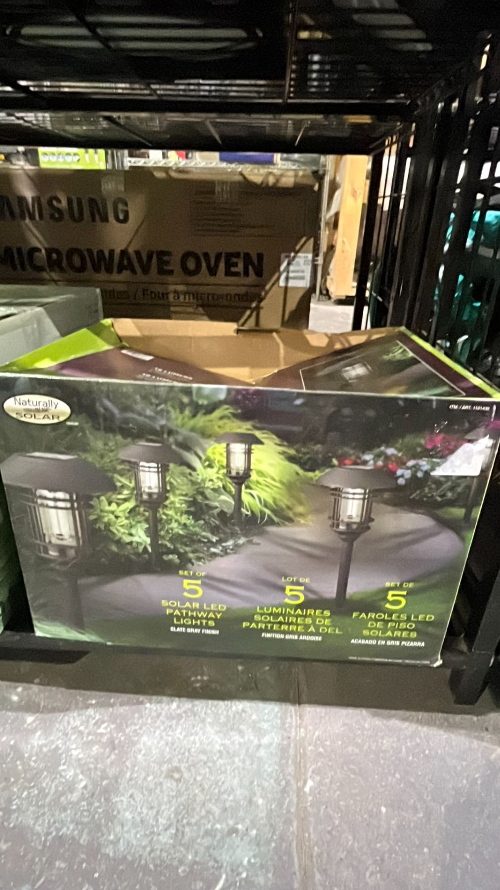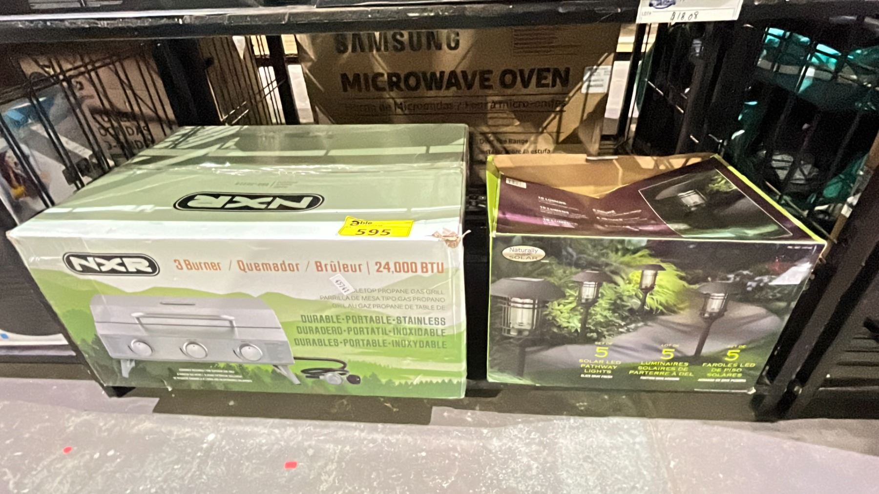 SHELF LOT OF NXR PORTABLE BBQ AND SOLAR PATHWAY LIGHTS *UNKNOWN WORKING CONDITION/ MAY BE MISSING PIECES*
