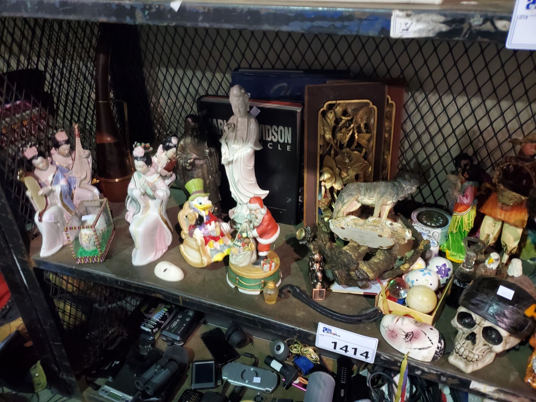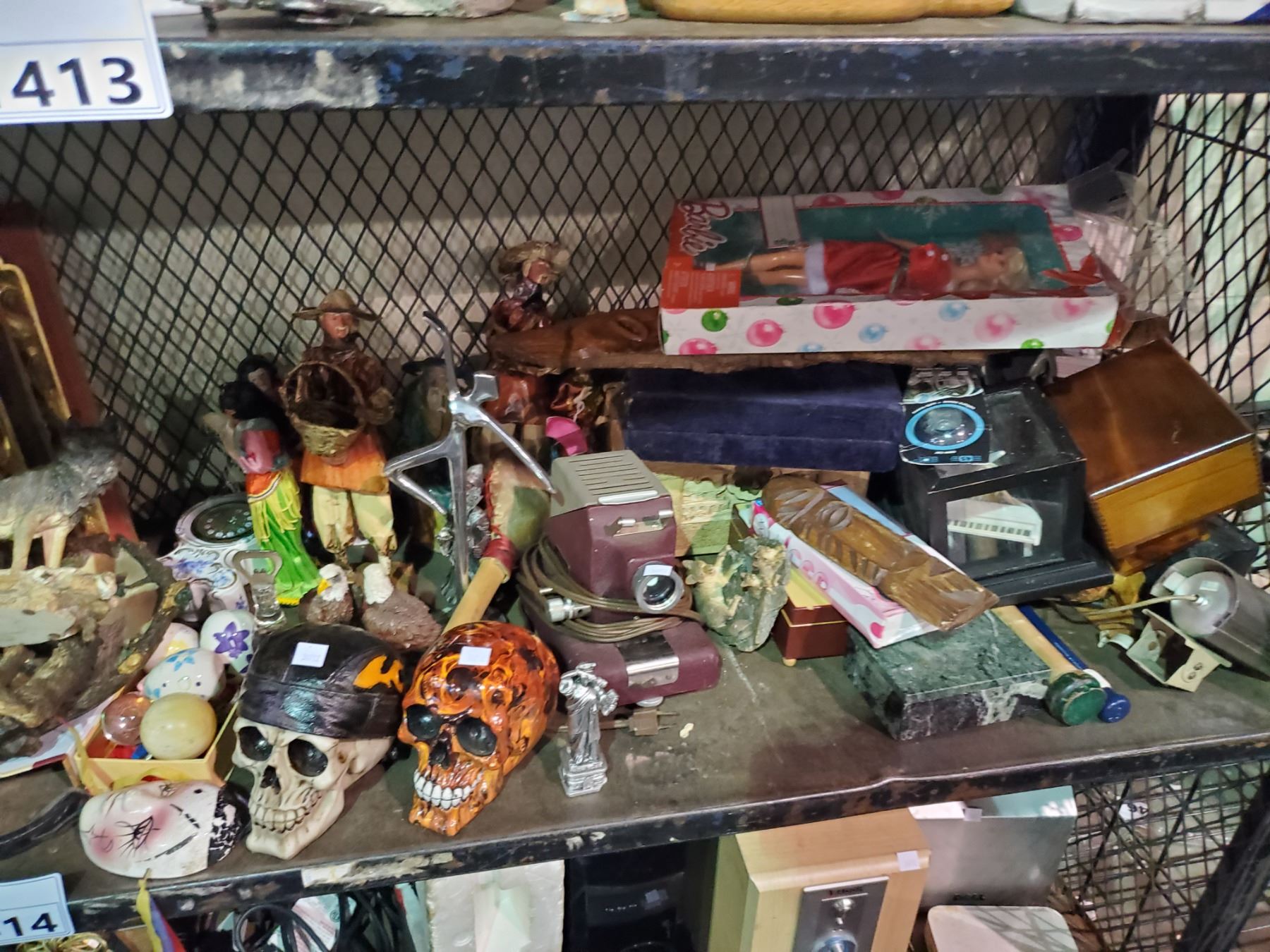SHELF LOT OF ORNAMENTS, BARBIE, BOOKS & MORE