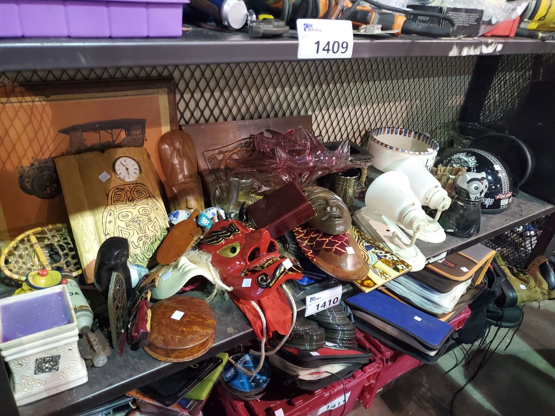 SHELF LOT OF ORNAMENTS, MASKS, HELMET & MORE
