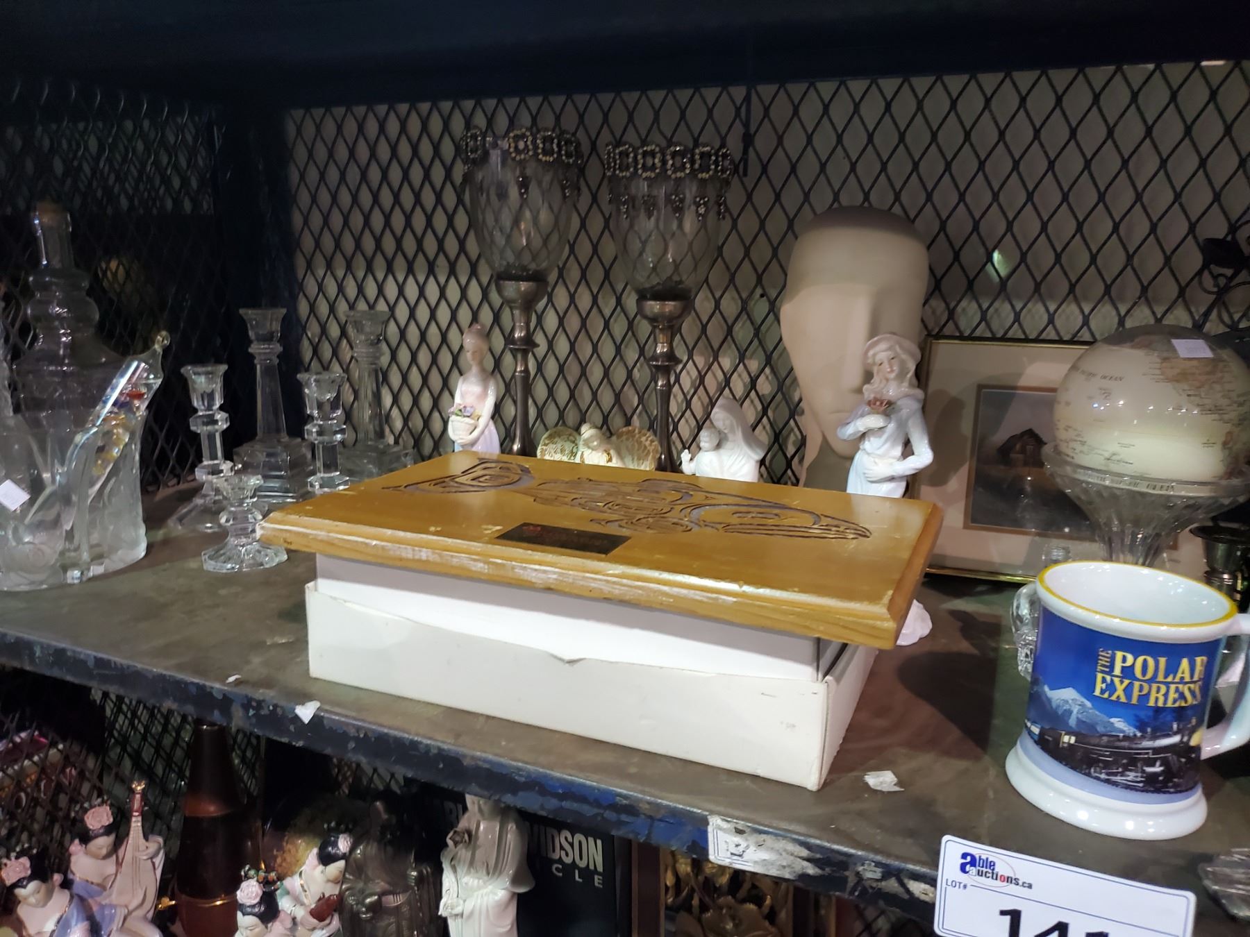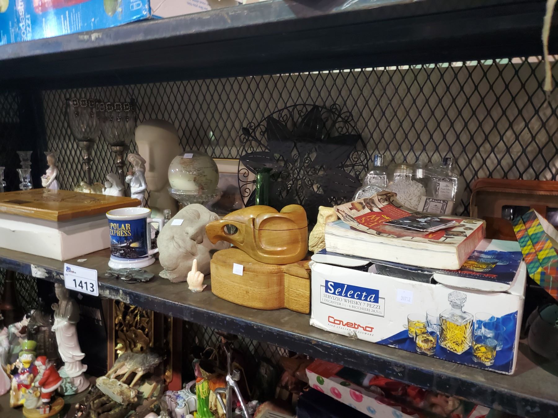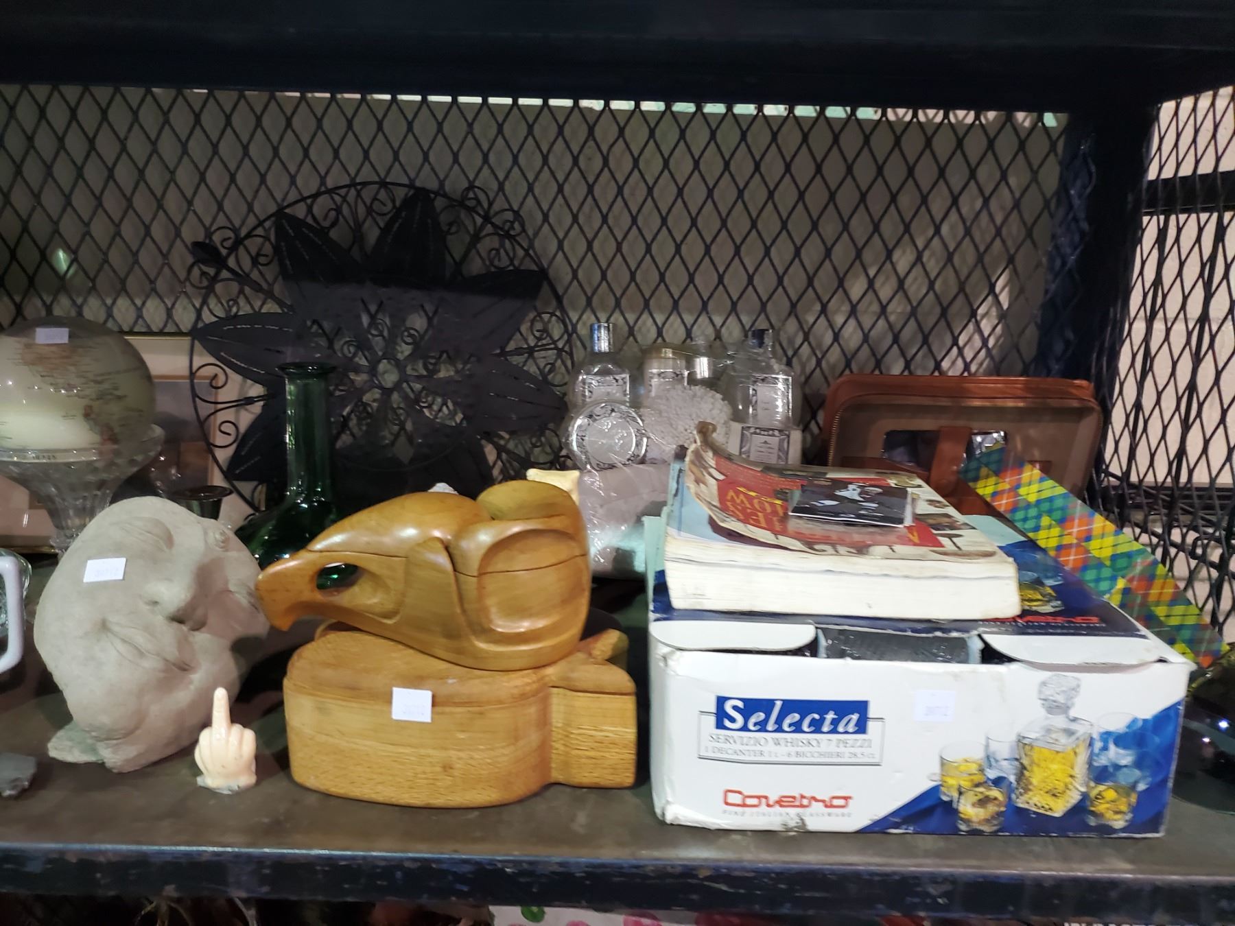 SHELF LOT OF ORNAMENTS, NATIVE CARVING, GLASSWARE & MORE