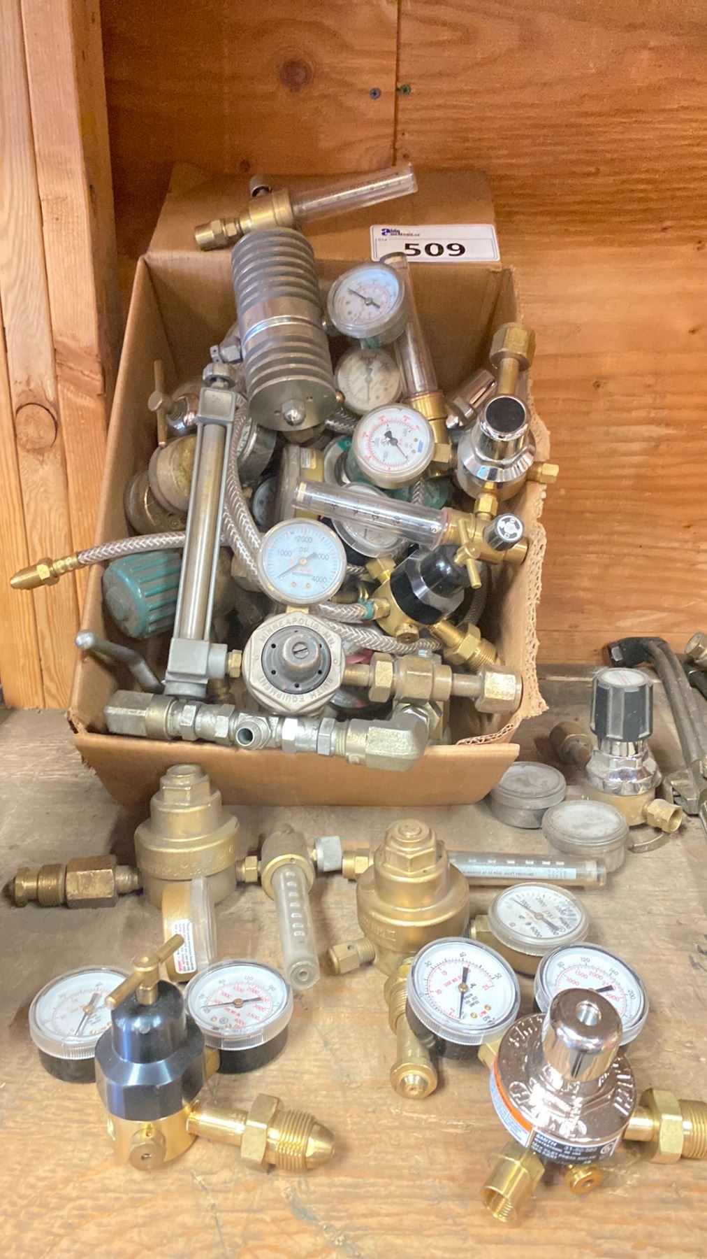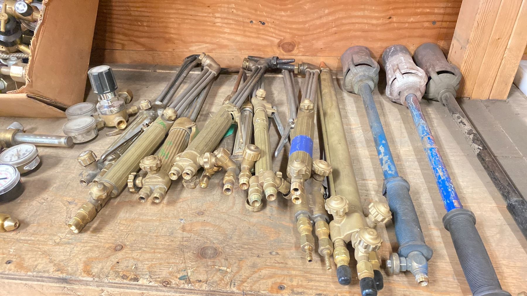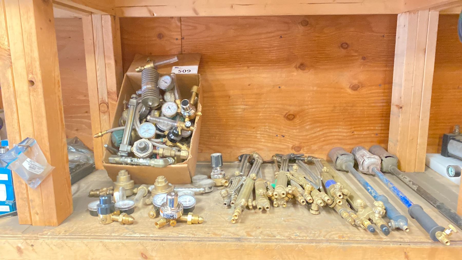 SHELF LOT OF OXYACETYLENE WELDING TORCHES, TIGER TORCHES & ASSORTED TANK GAUGES