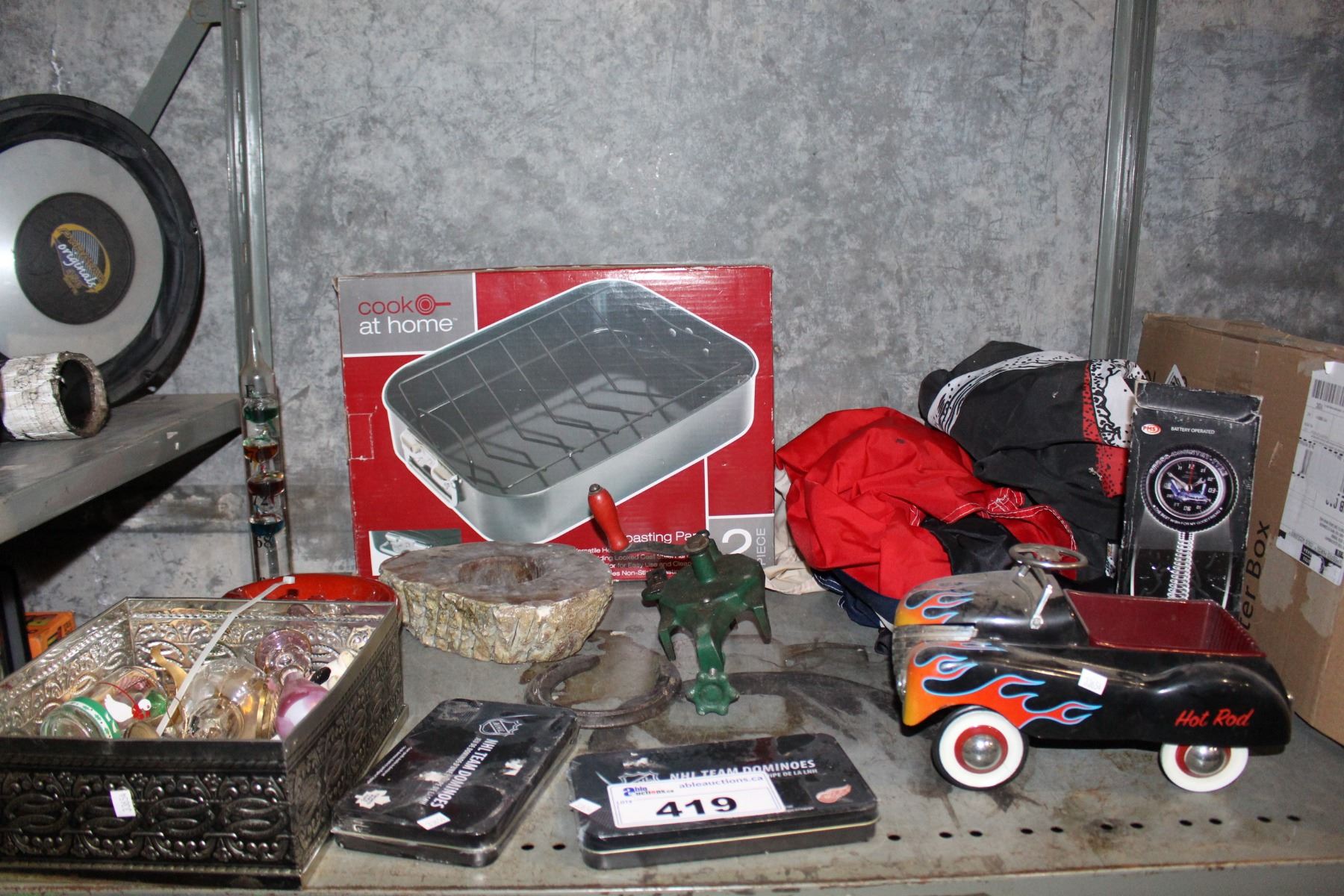 SHELF LOT OF PANS, GLASSES AND HOUSEHOLD GOODS