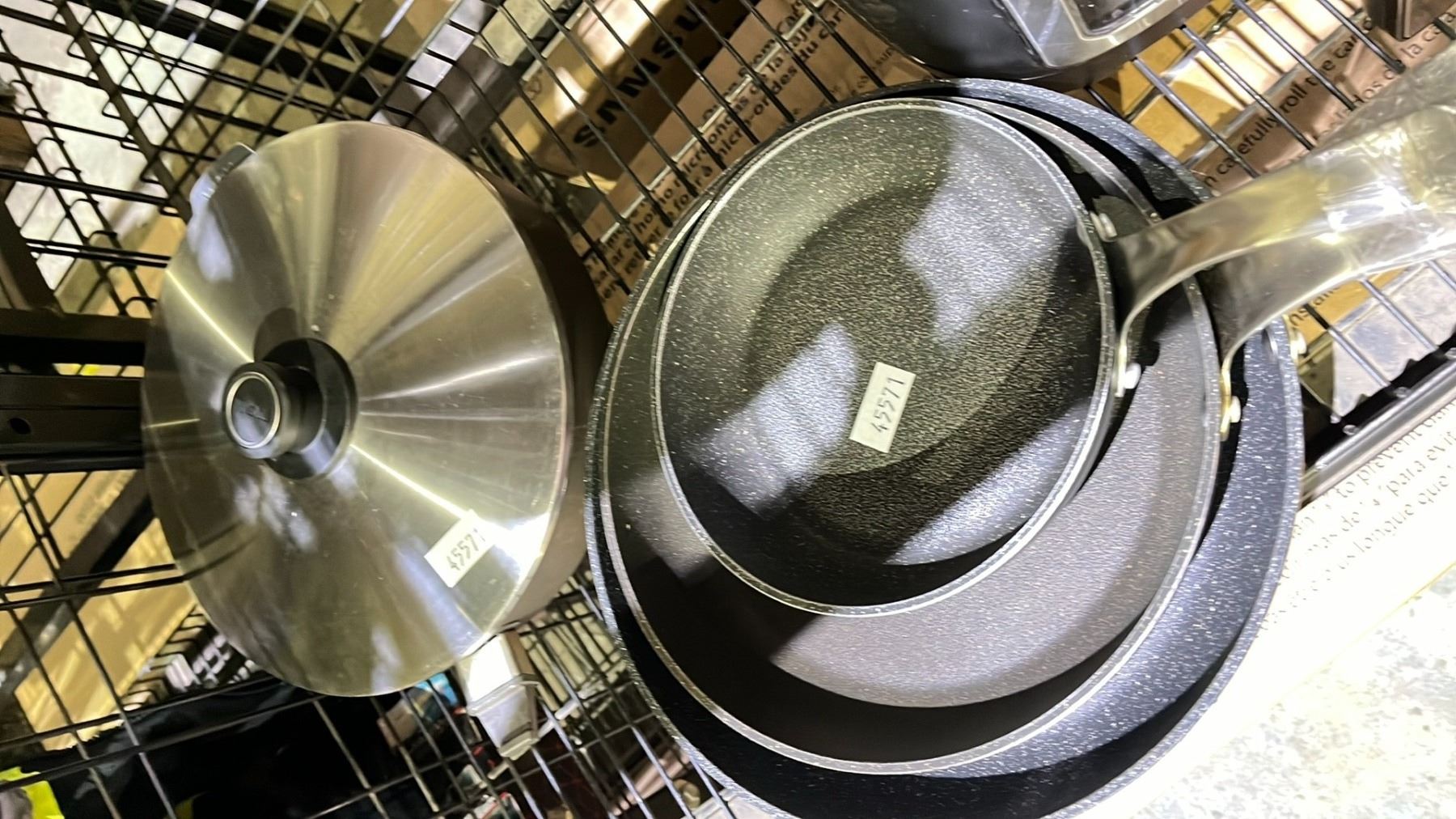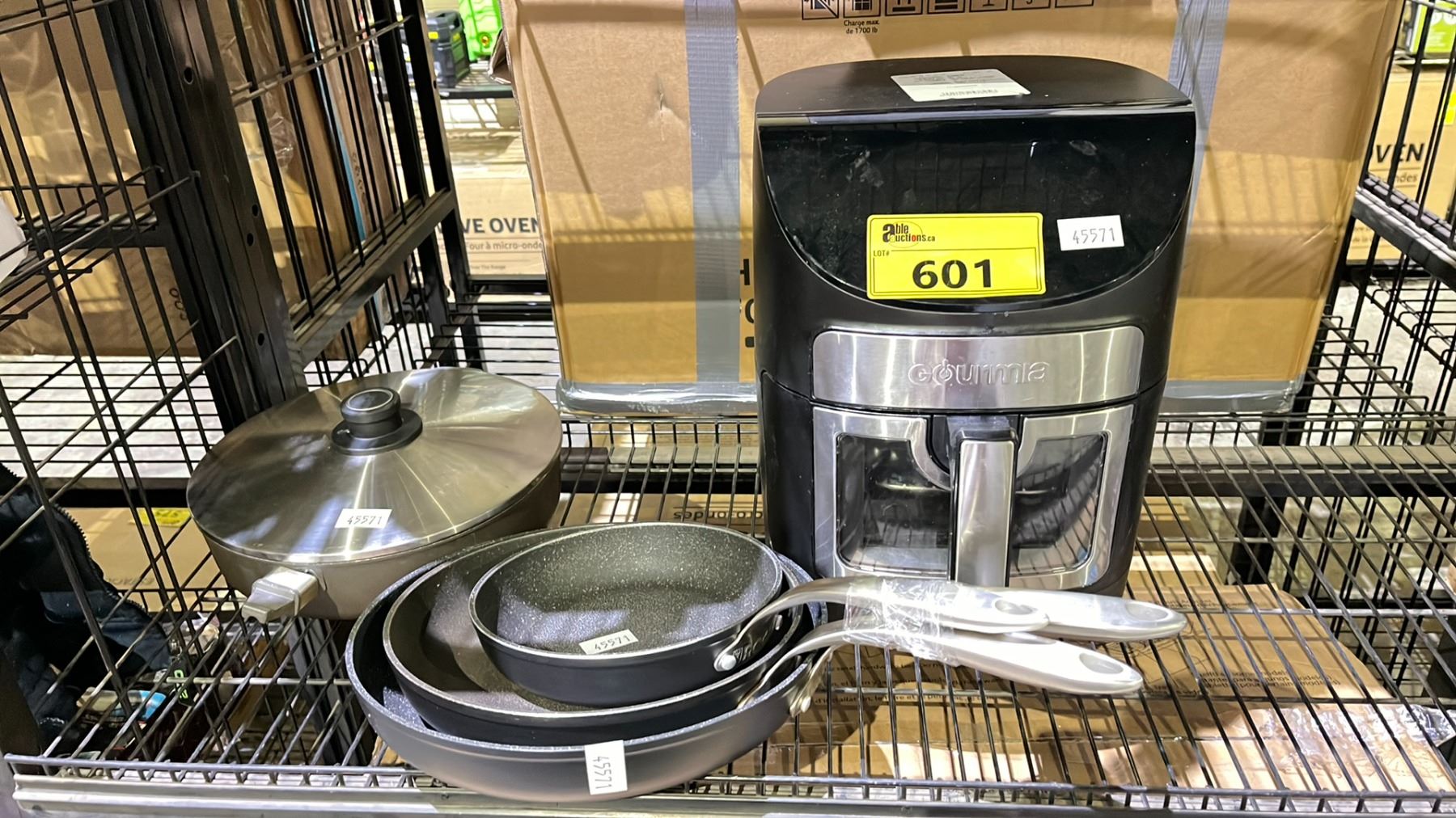 SHELF LOT OF PANS, GOURMIA AIR FRYER AND MORE *UNKNOWN WORKING CONDITION/ MAY BE MISSING PIECES*