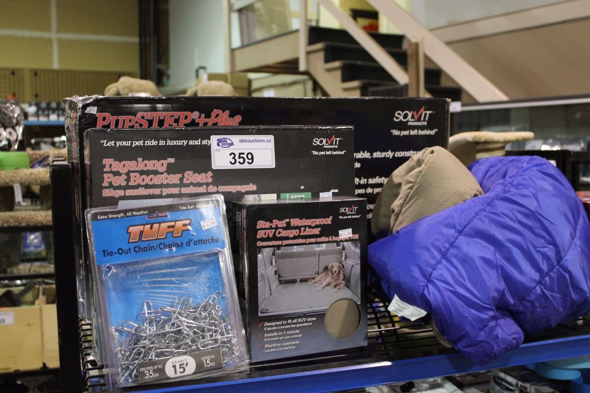 SHELF LOT OF PET STAIRS, BOOSTER SEAT, SUV CARPET LINER, TRAVEL BEDS