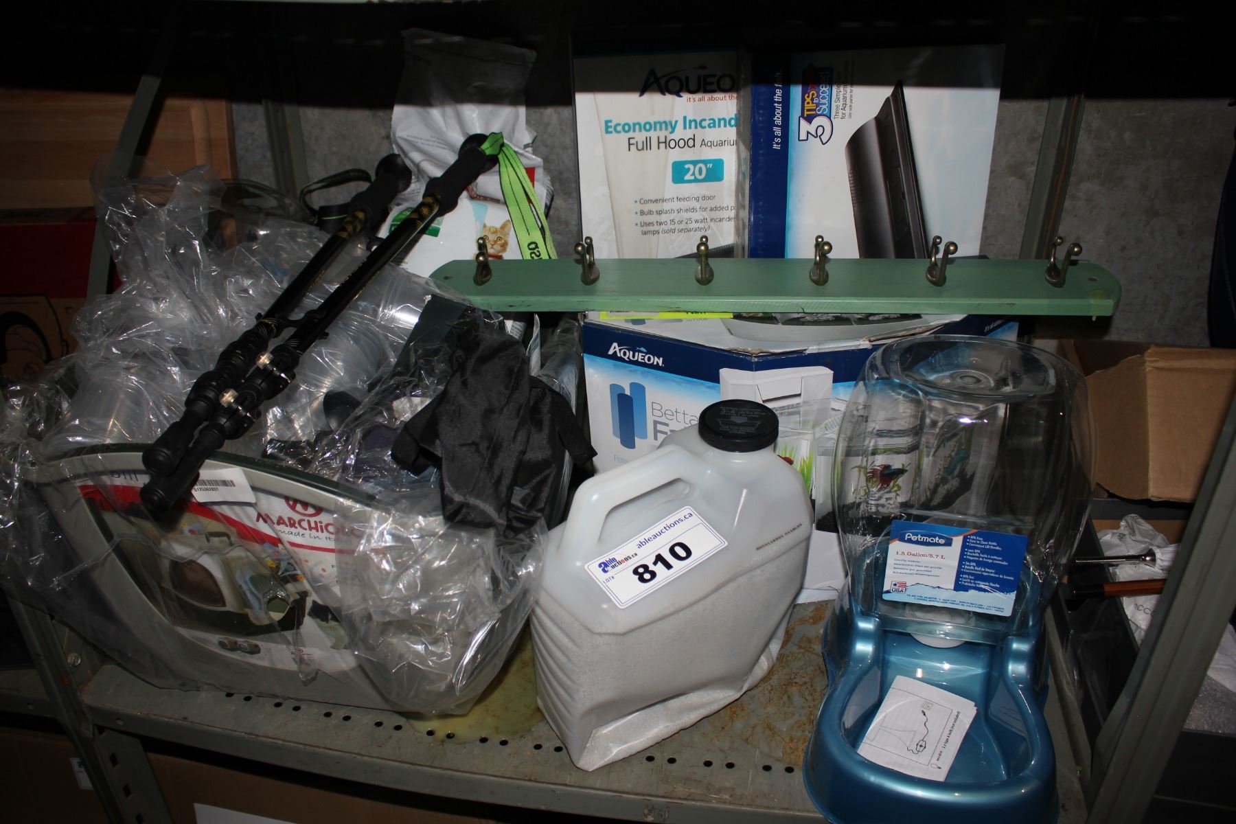 SHELF LOT OF PET SUPPLIES INCLUDING BETTA FALLS, WATER FOUNTAIN, LITTER BOX, FOOD, MEDICINE AND