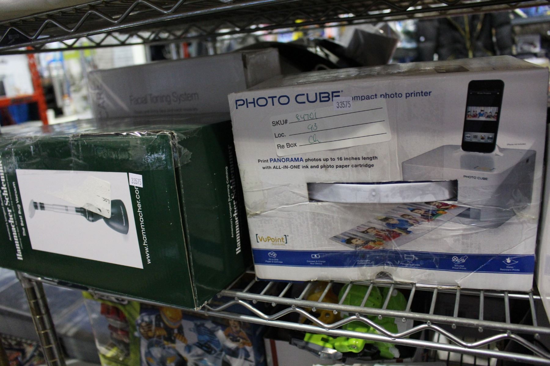 SHELF LOT OF PHOTOCUBE PRINTER, BUG VACUUM, FACIAL TONING SYSTEM AND MORE