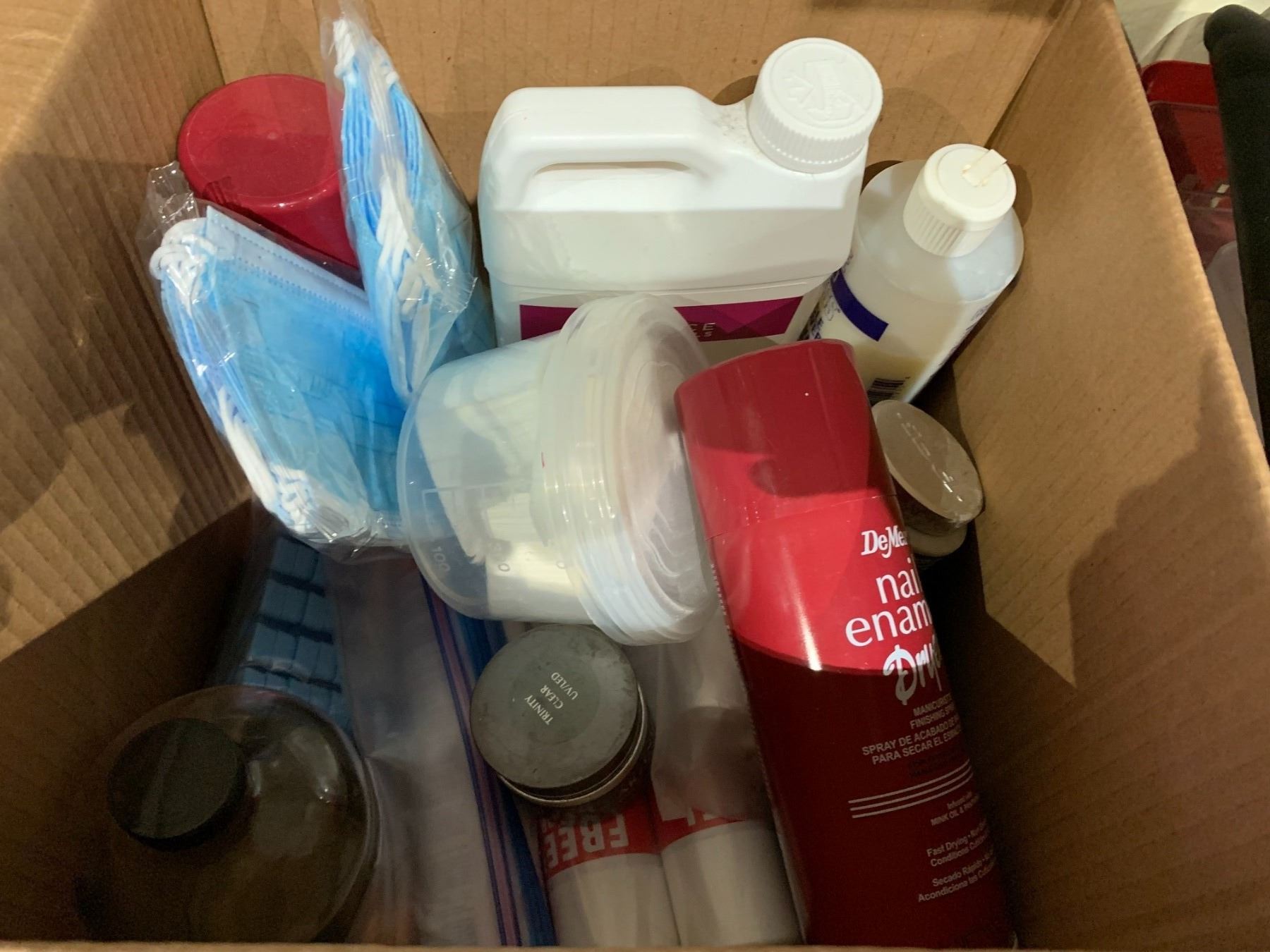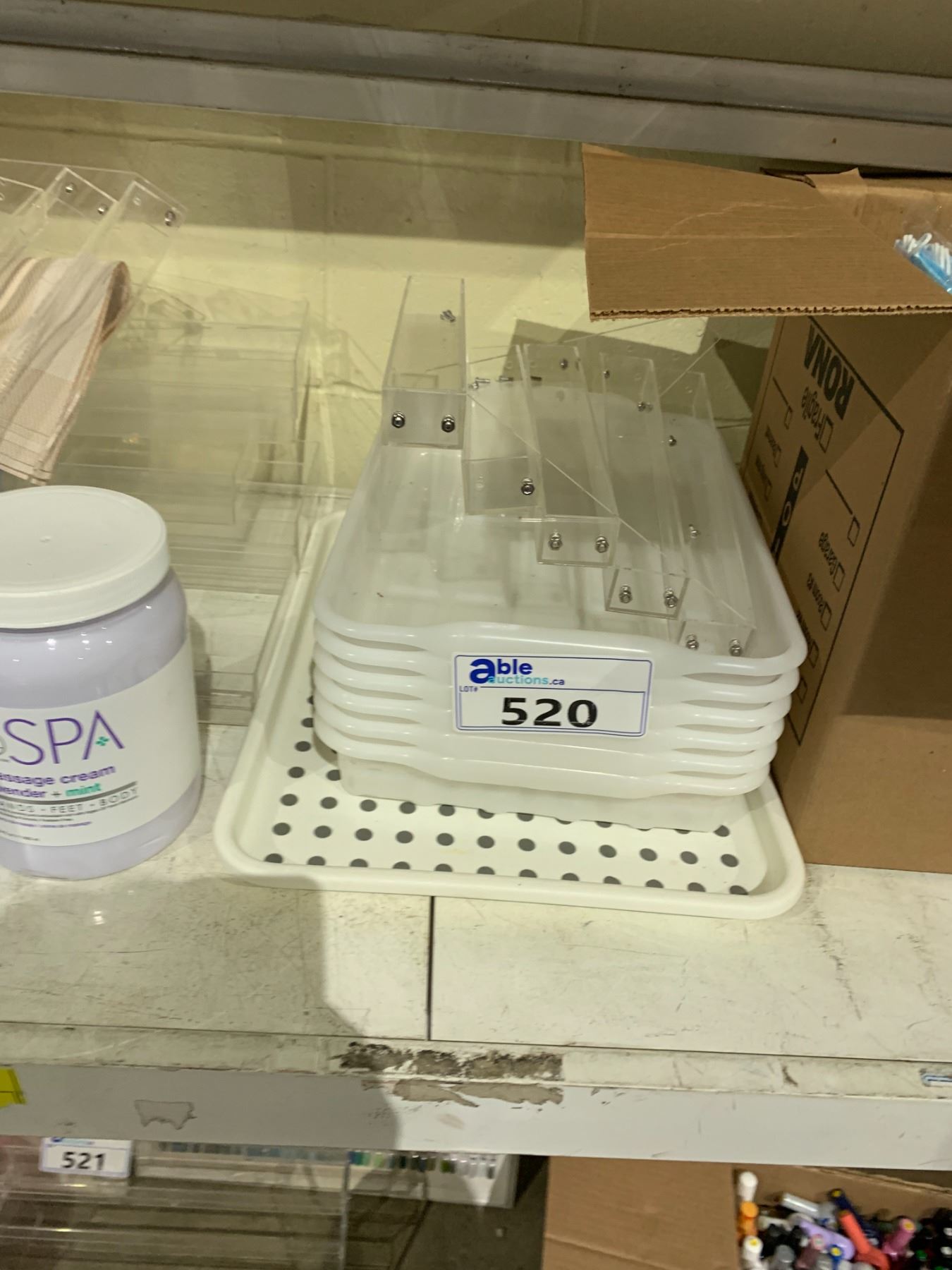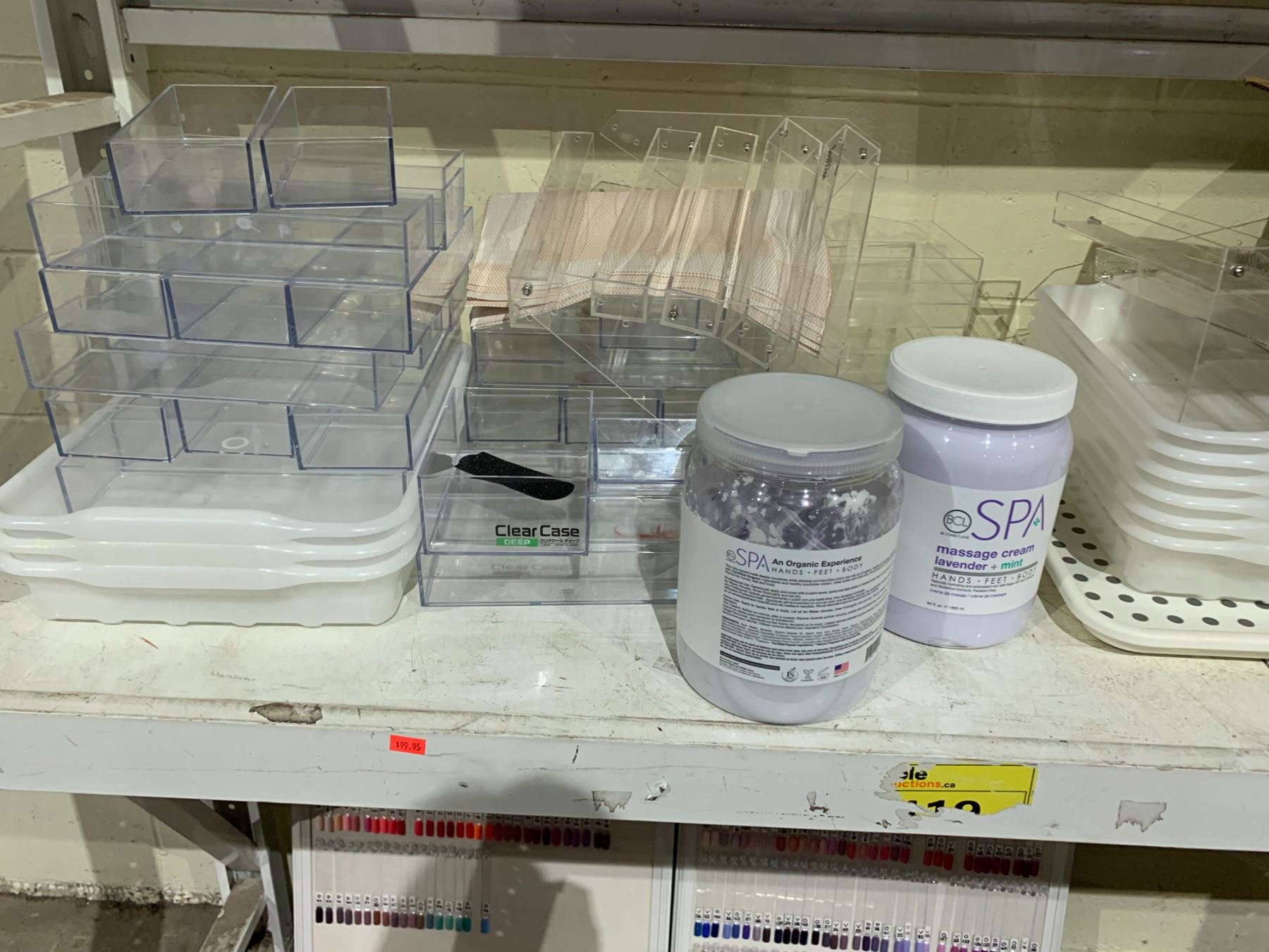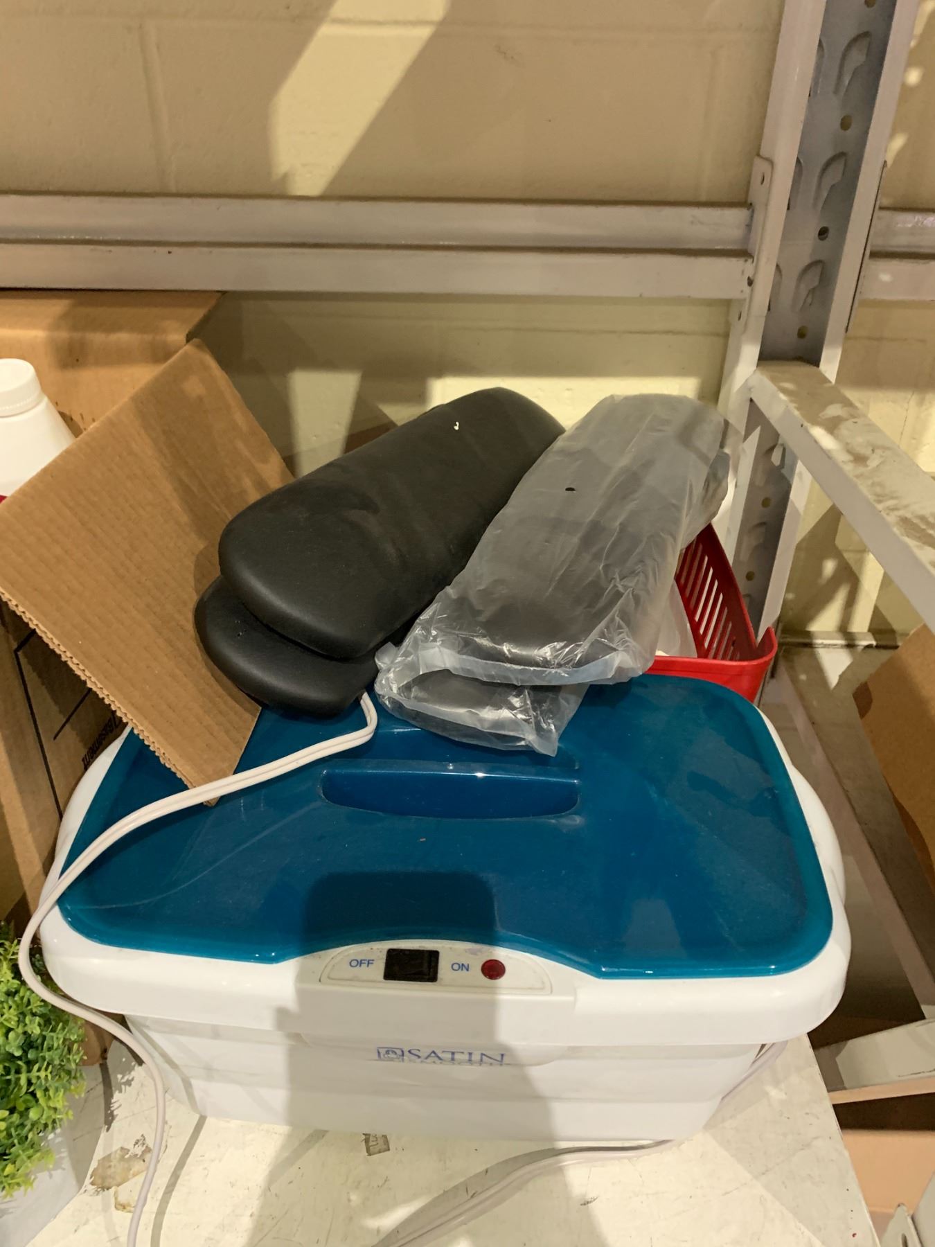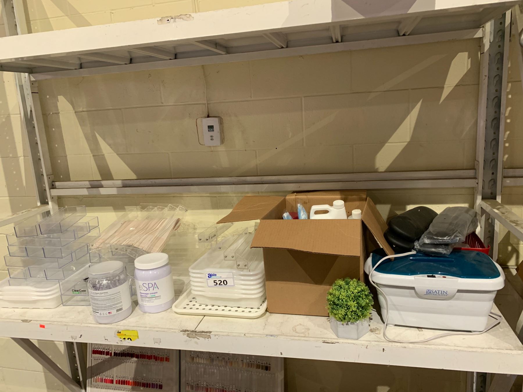 SHELF LOT OF PLASTIC BINS, SATIN SMOOTH PARAFFIN WARMER, MASSAGE CREAM AND MORE