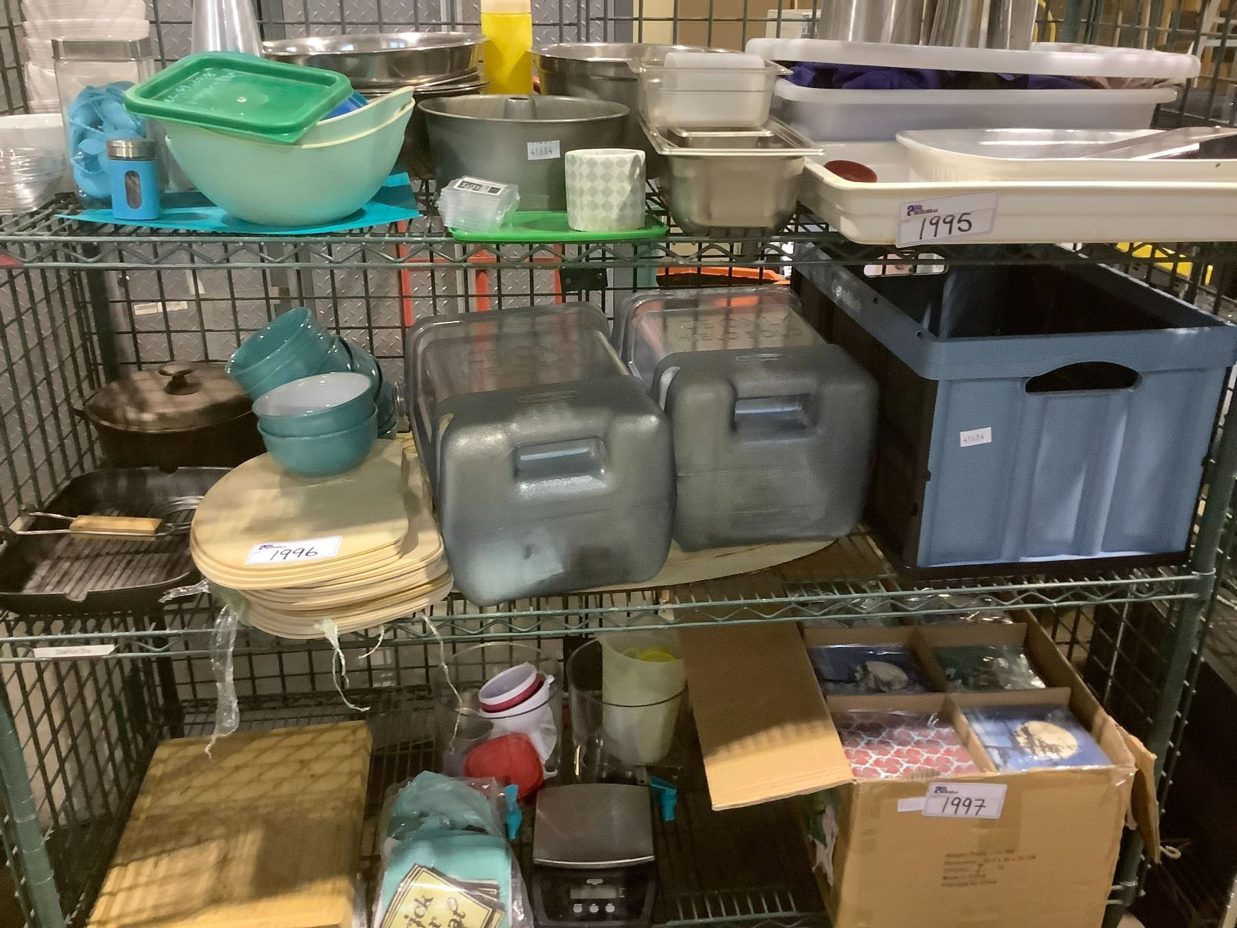 SHELF LOT OF PORTABLE ICE CUBE TOTES, CUTTING BOARDS, CAST IRON BEAN POT, AND MORE