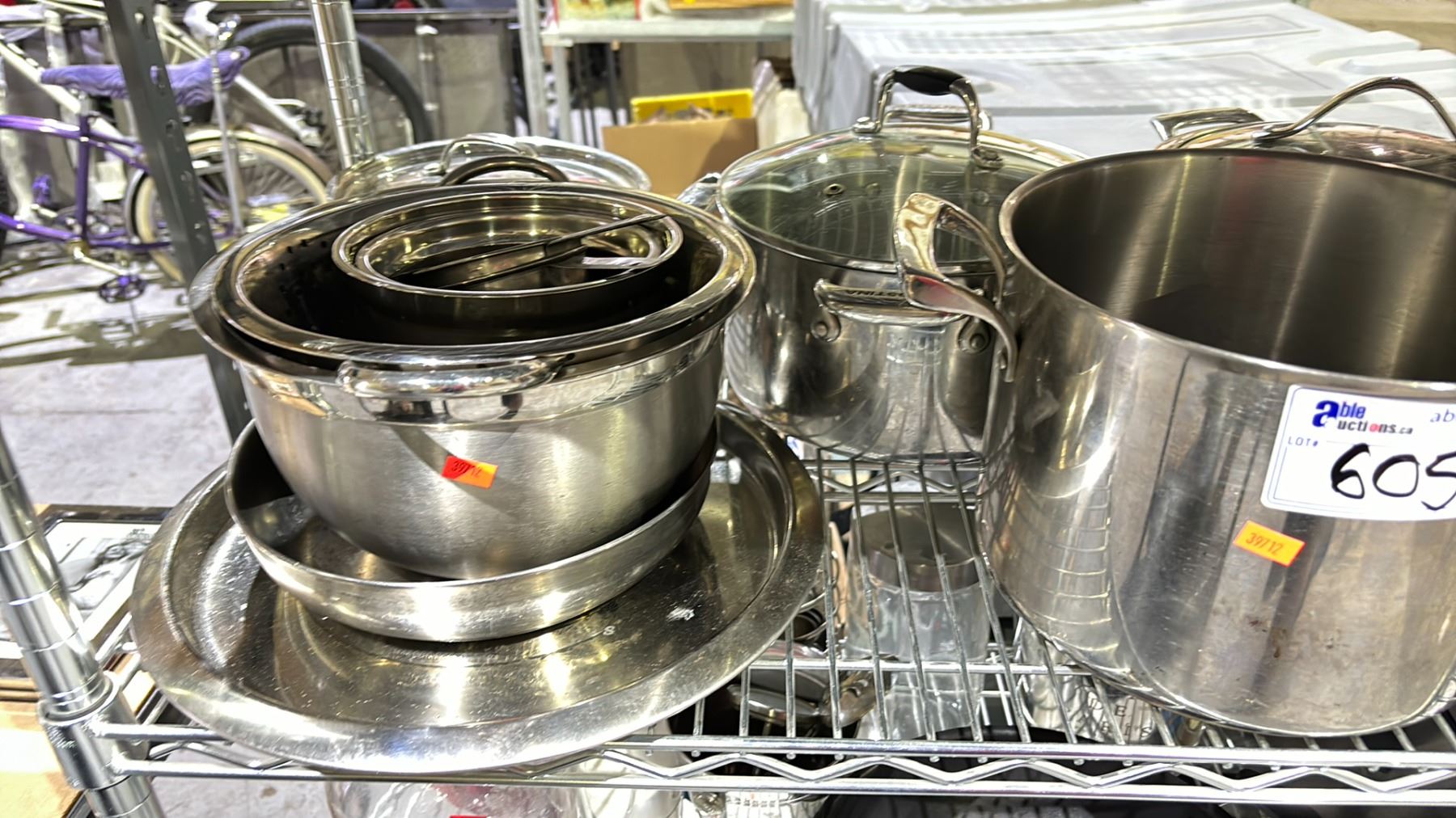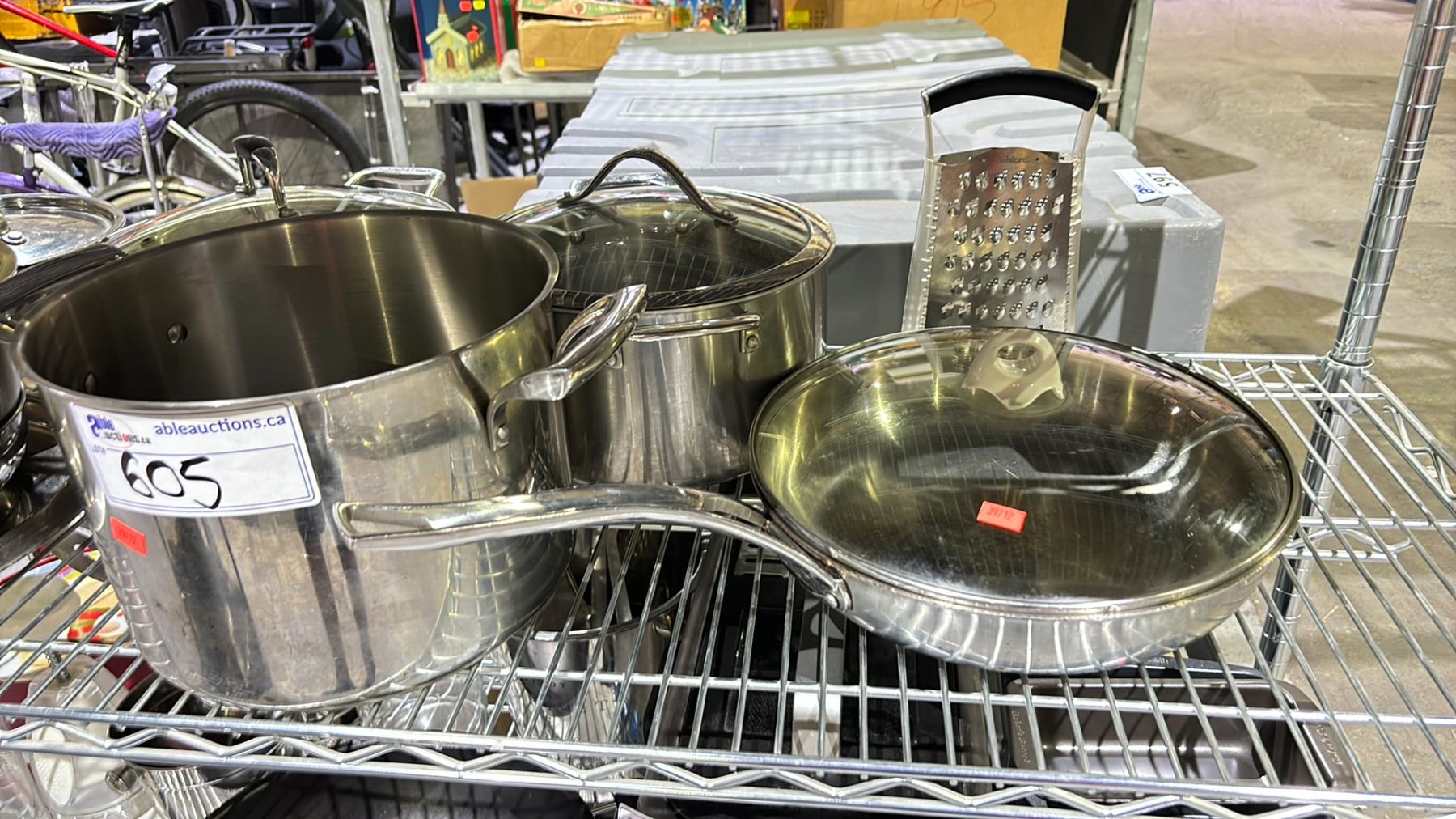 SHELF LOT OF POTS, BOWLS, CHEESE GRATER AND MORE
