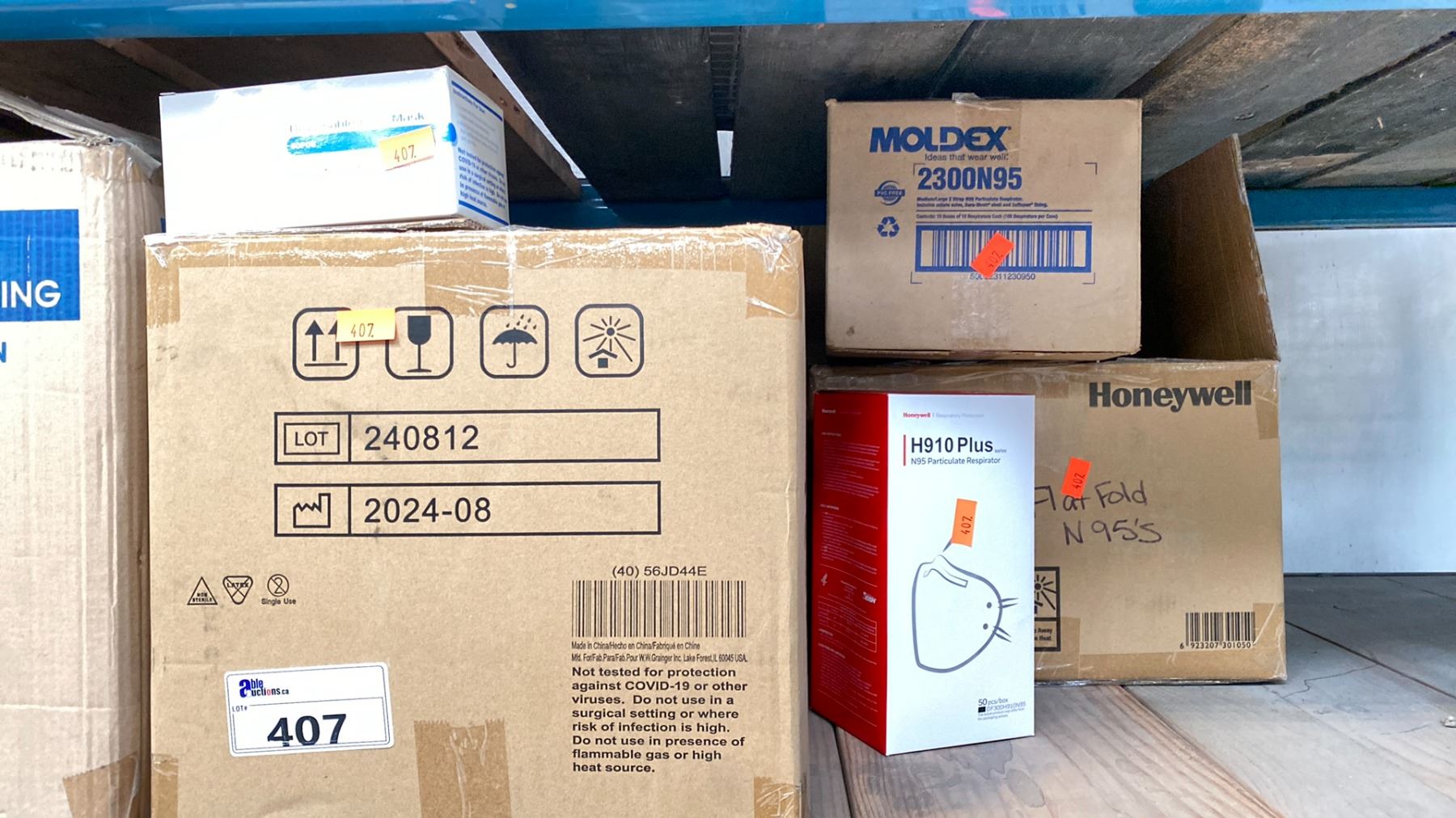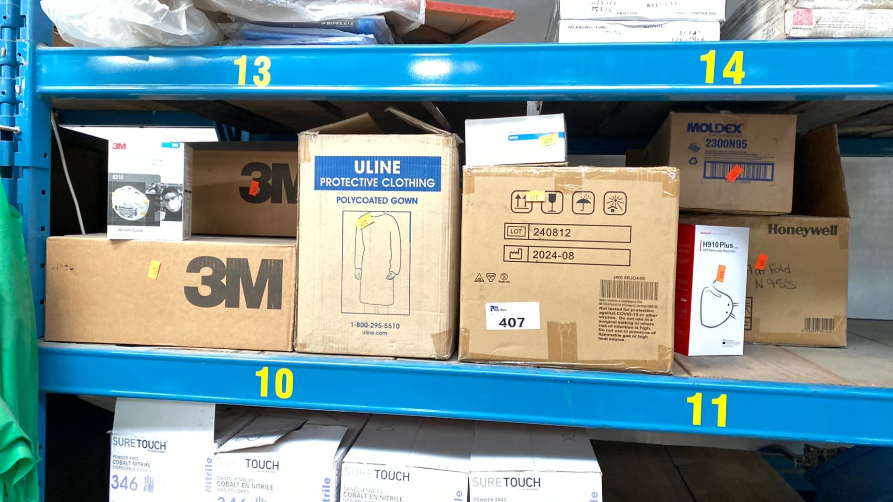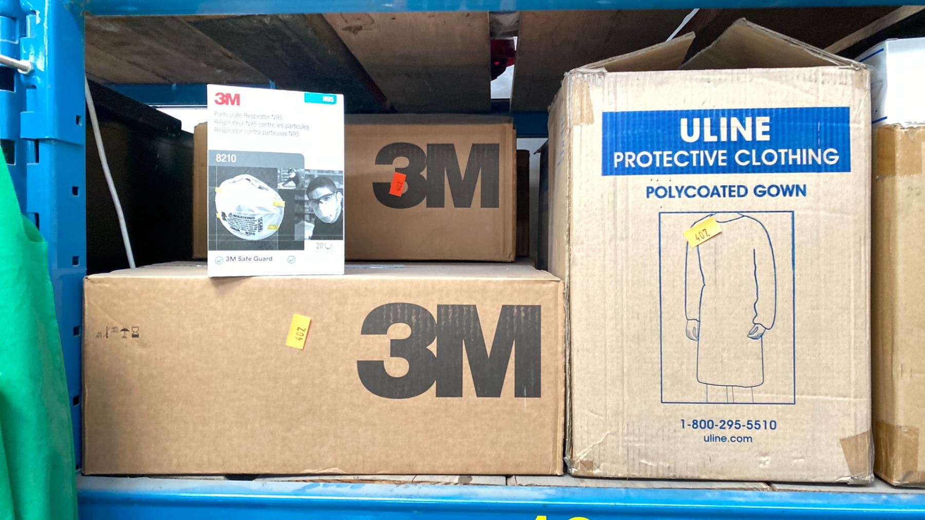 SHELF LOT OF PPE ITEMS. 7 CASES OF 3M PARTICLE RESPIRATORS N95, 2 CASES ULINE POLY COATED GOWNS, LARGE CASE OF TK50 DISPOSABLE MASKS, CASE OF HONEYWELL N95 MASKS