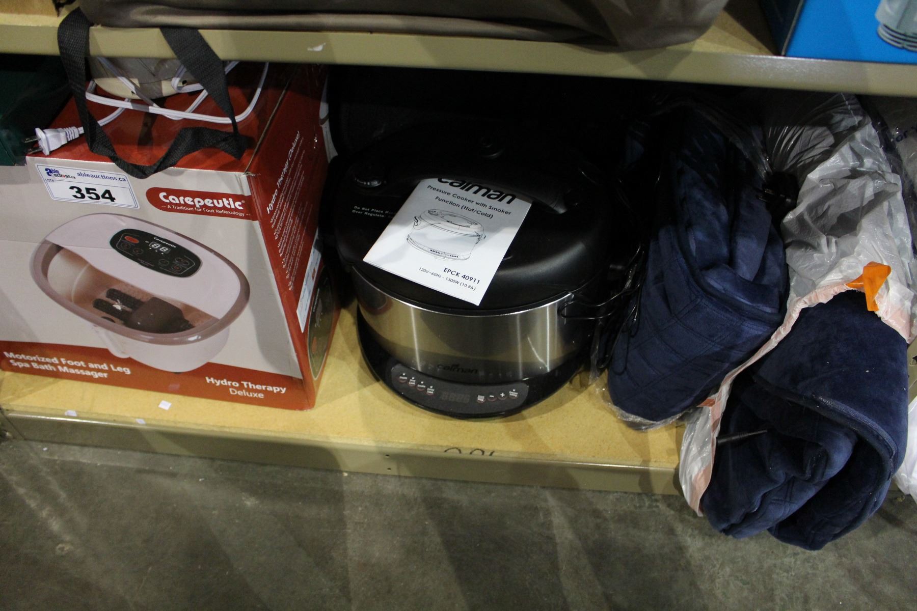 SHELF LOT OF PRESSURE COOKER, HEATING PADS AND MORE