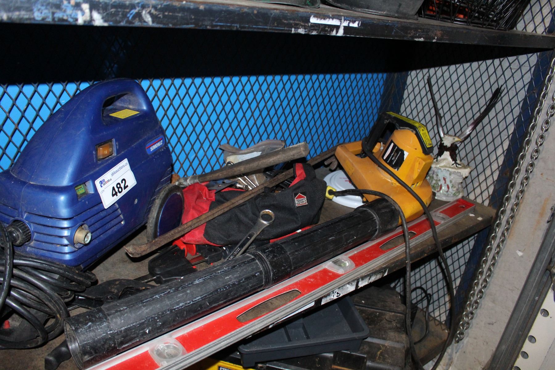 SHELF LOT OF PRESSURE WASHER, LEAF BLOWER AND MISC TOOLS