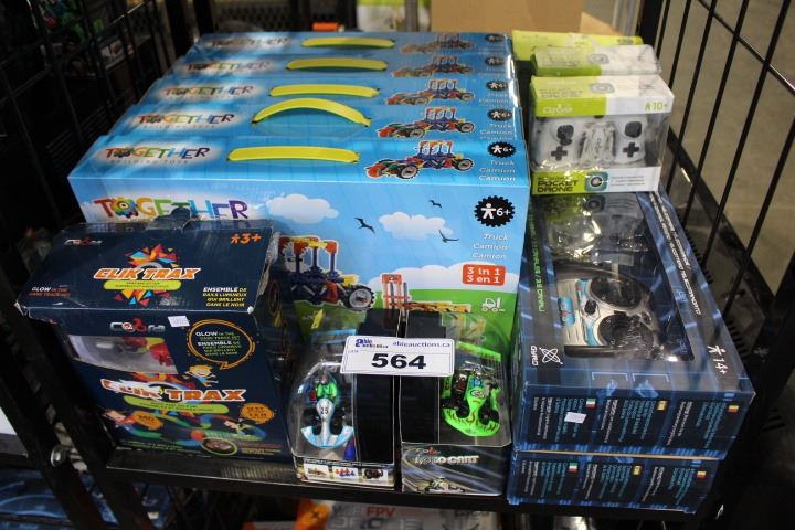 SHELF LOT OF RC TOYS AND BUILDING TOYS