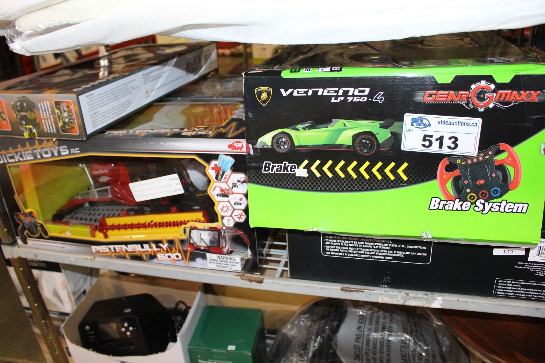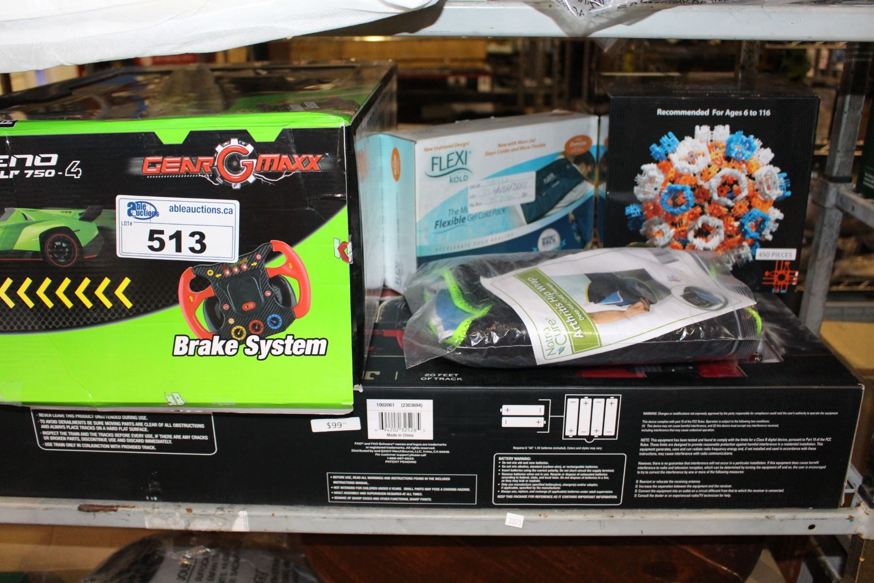 SHELF LOT OF REMOTE CONTROL CARS, GEL PACK AND MORE